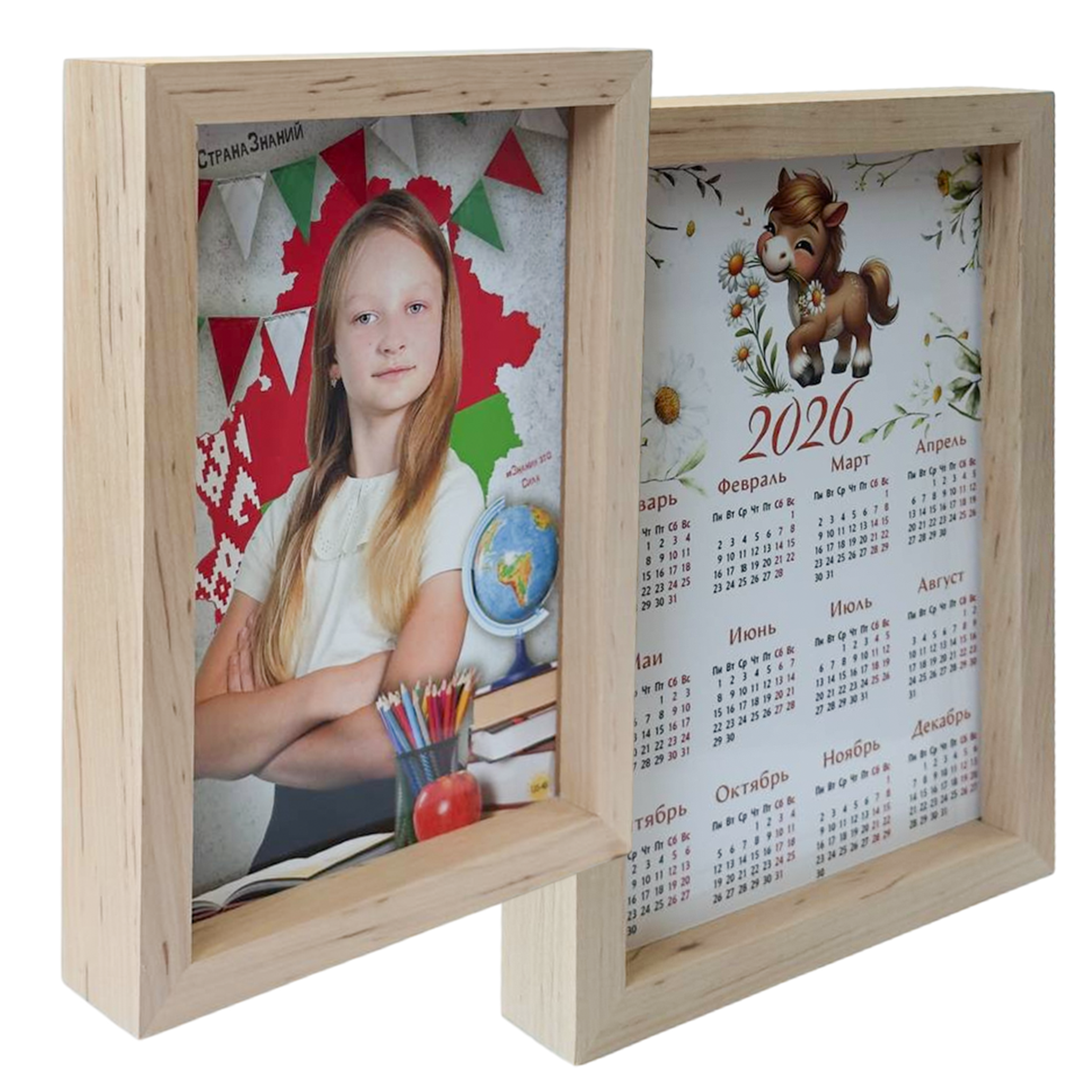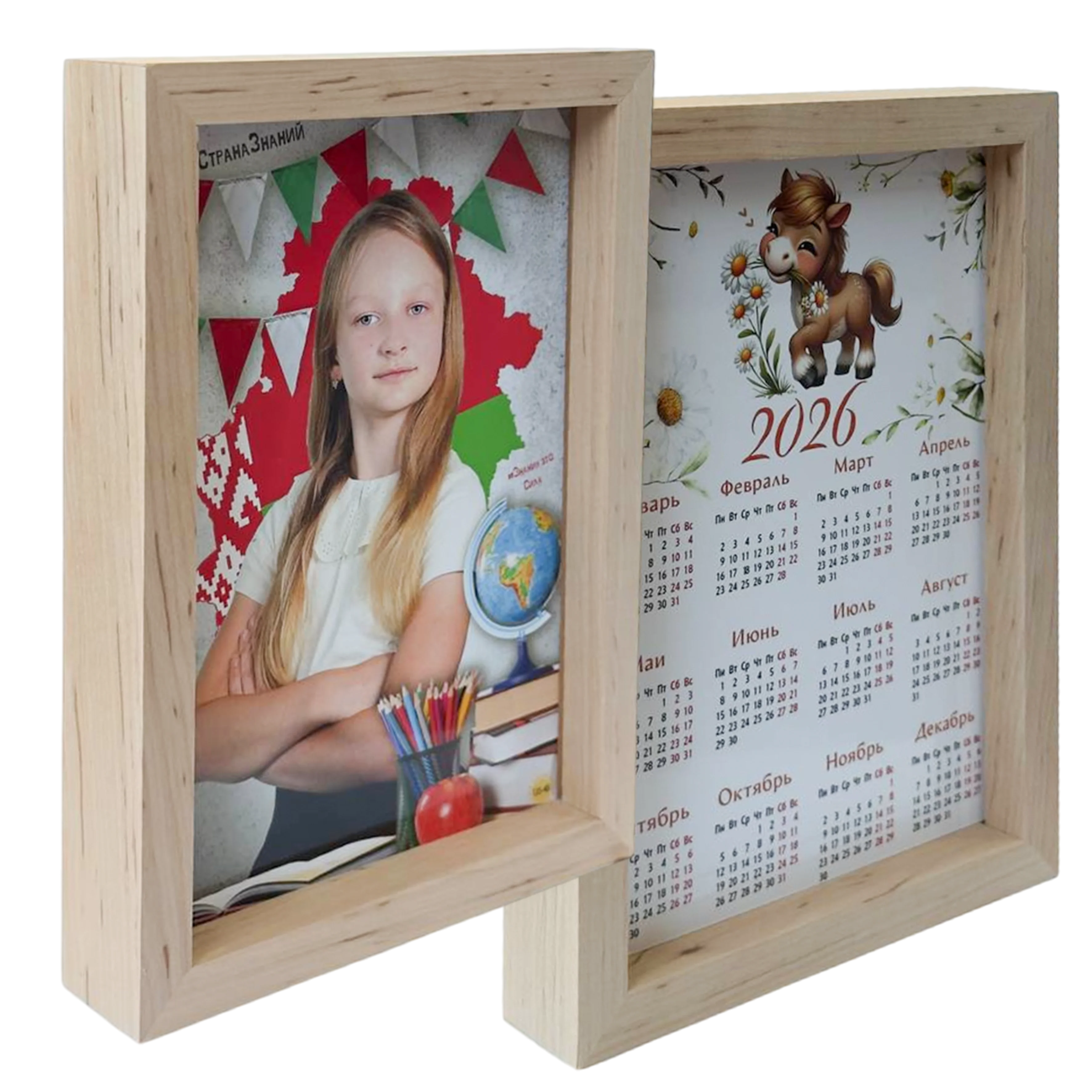 Двухстороння фотография размером 10х15 см. С одной стороны фото, с другой стороны календарь на 2026 год. Рамка выполнена из деревянных панелей. Размер рамки 13х18 см.
