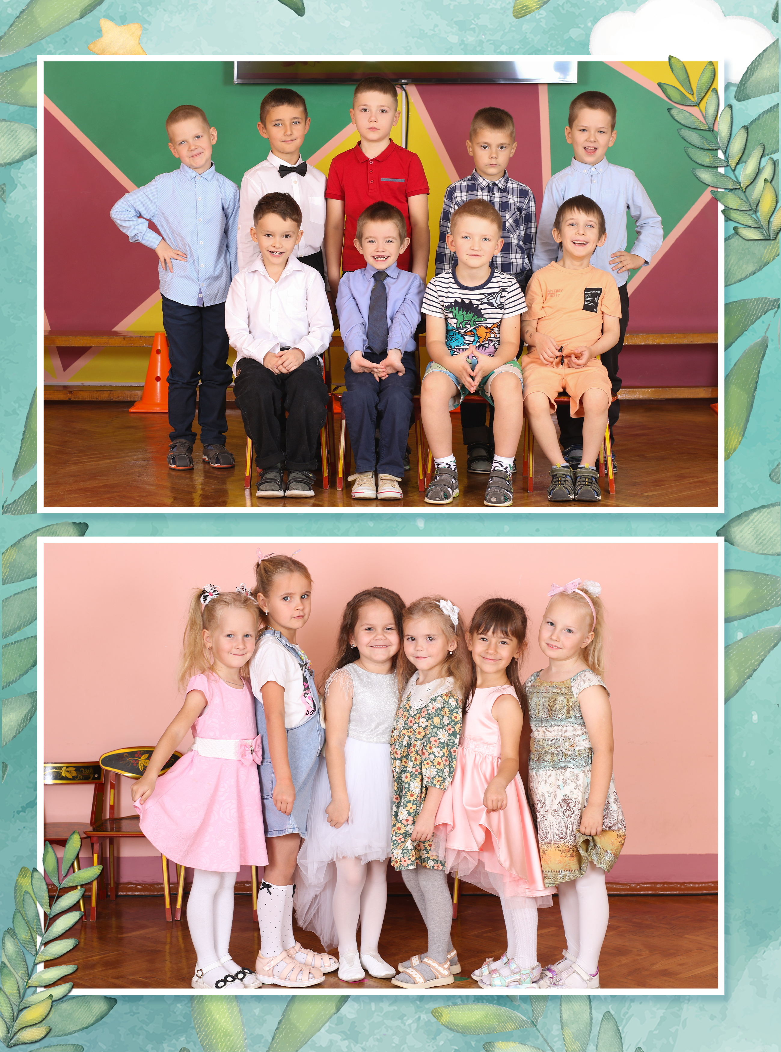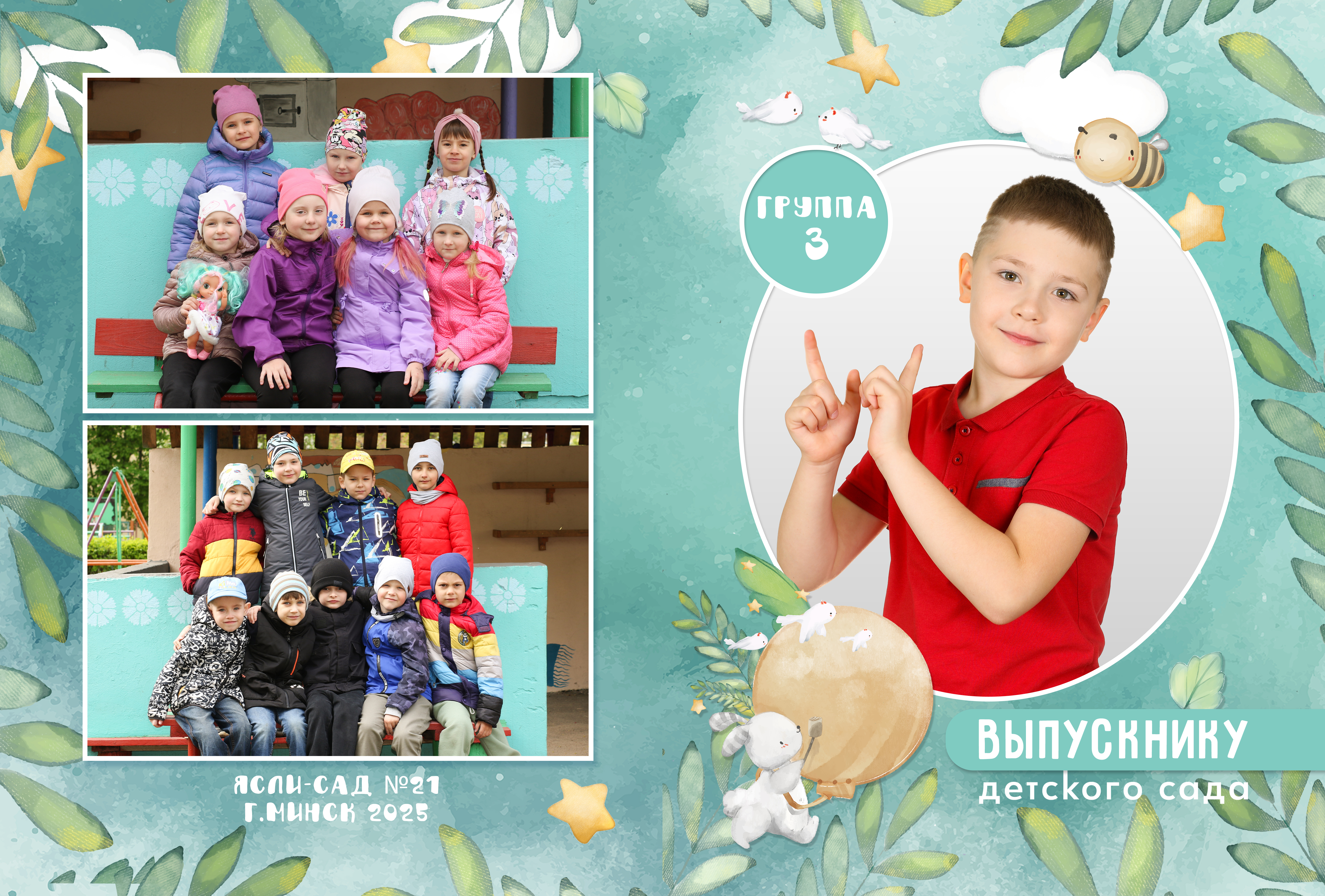В альбом входит: 2-3 портрета (на обложке, внутри альбома, в виньетке), 1 общее фото всей группы, 1 общее фото девочек, 1 общее фото мальчиков, 25-35 сюжетных кадров (в зависимости от численности группы).