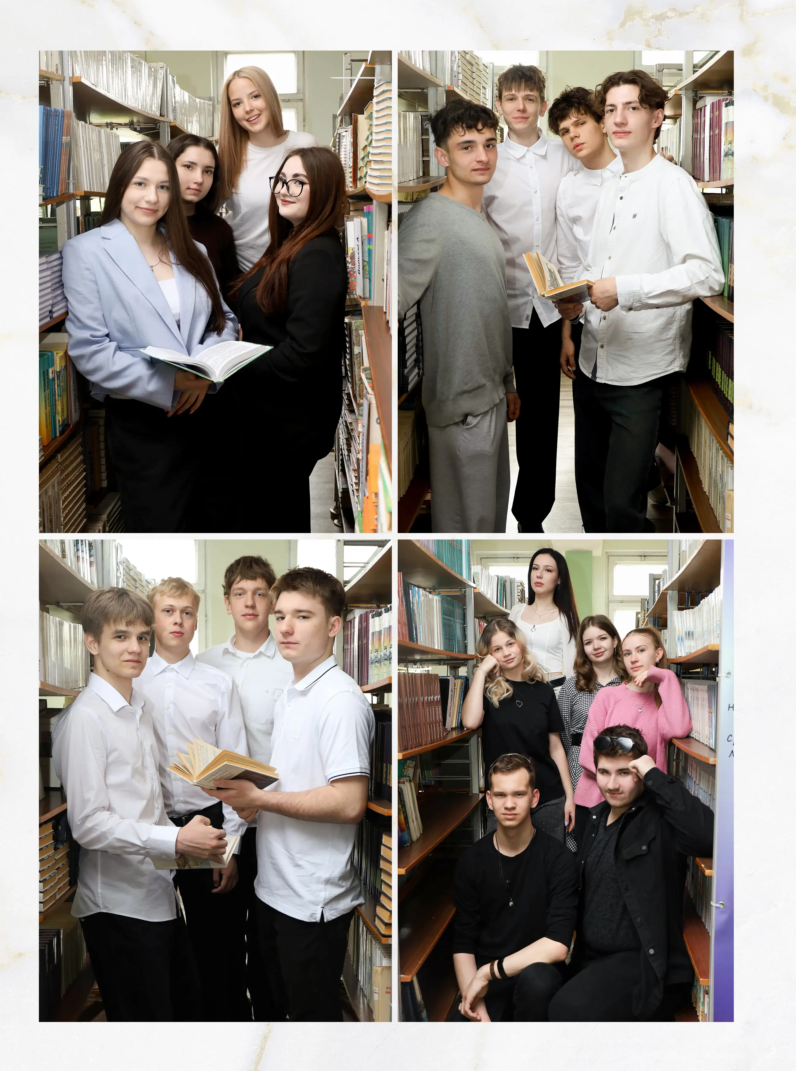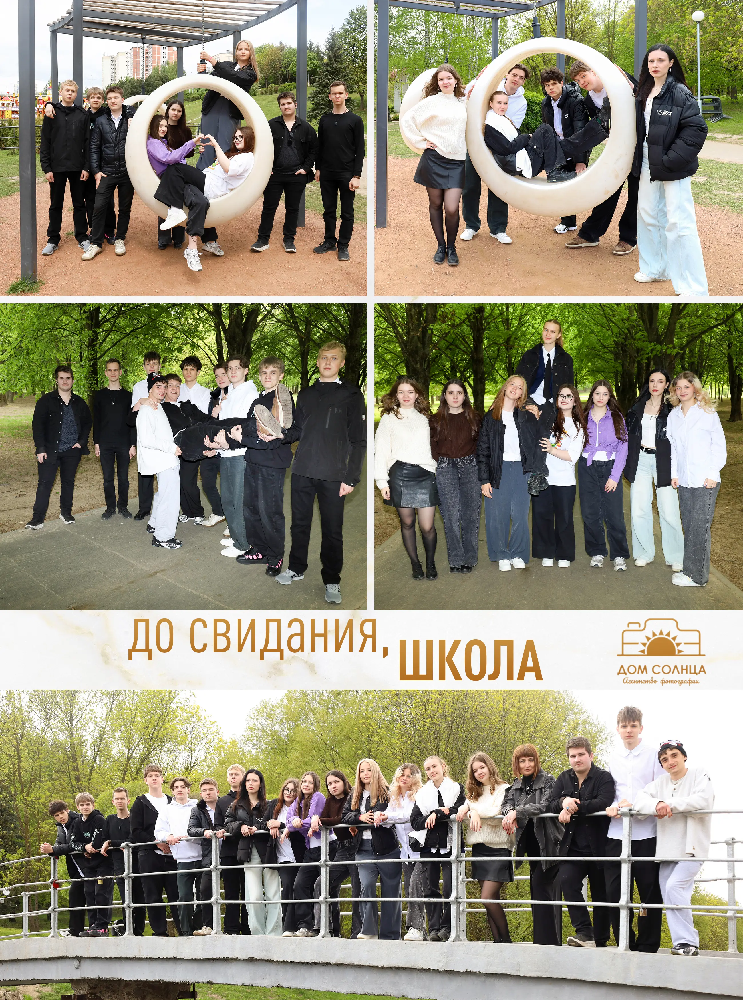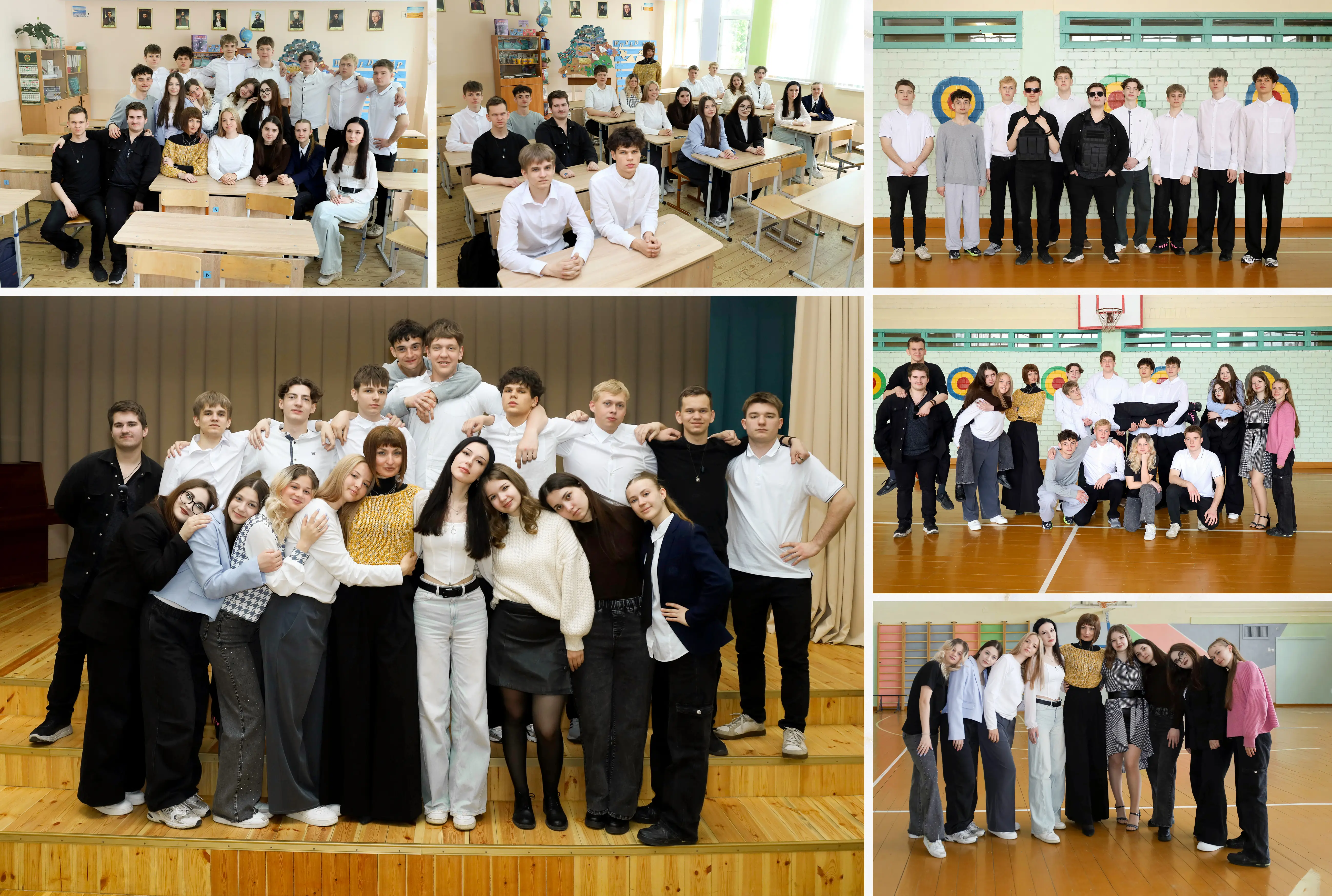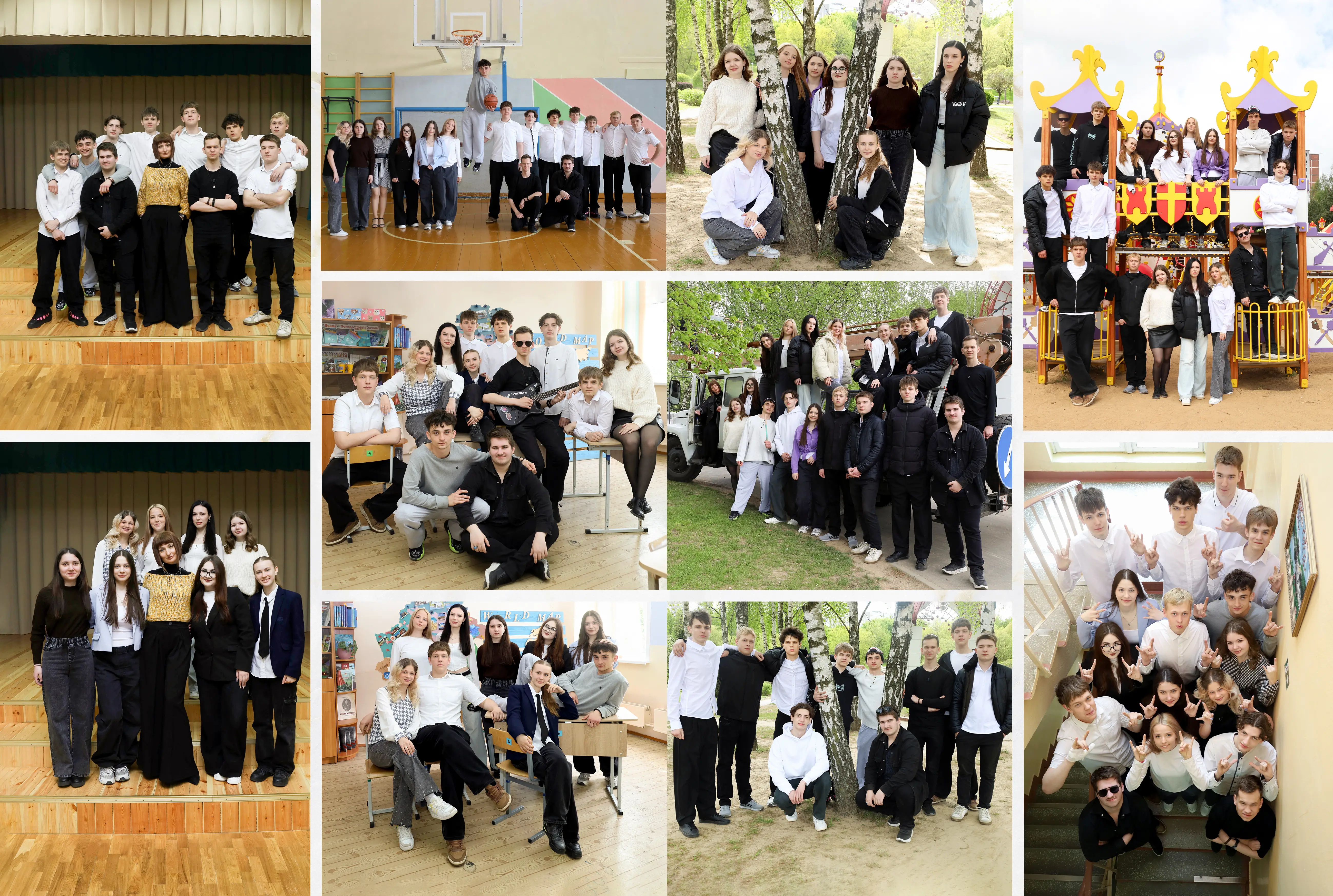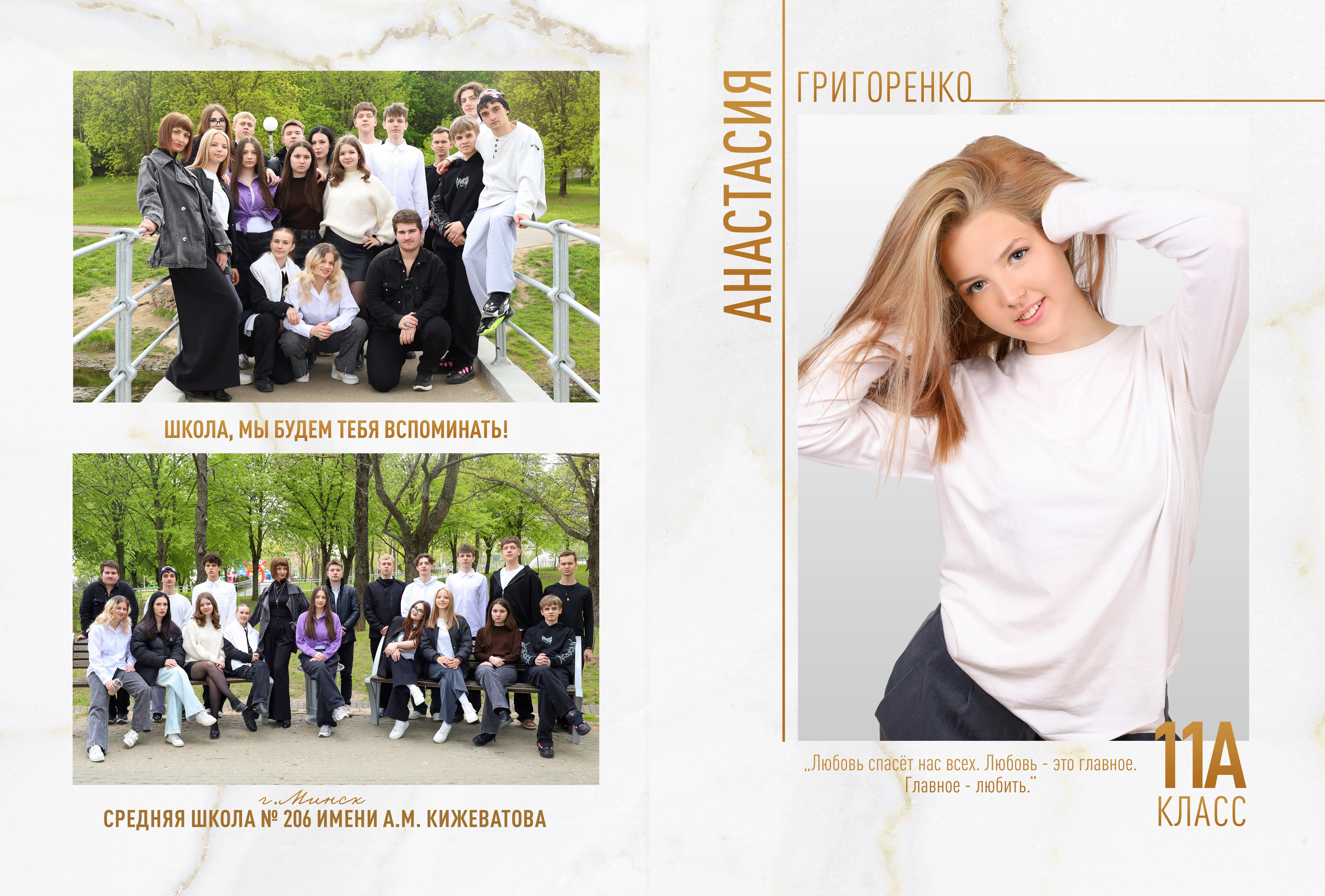 В альбом входит: 2-3 портрета (на обложке, внутри альбома, в виньетке), 1 общее фото всего класса, 1 общее фото девочек, 1 общее фото мальчиков, 15-20 сюжетных кадров (в зависимости от численности класса).