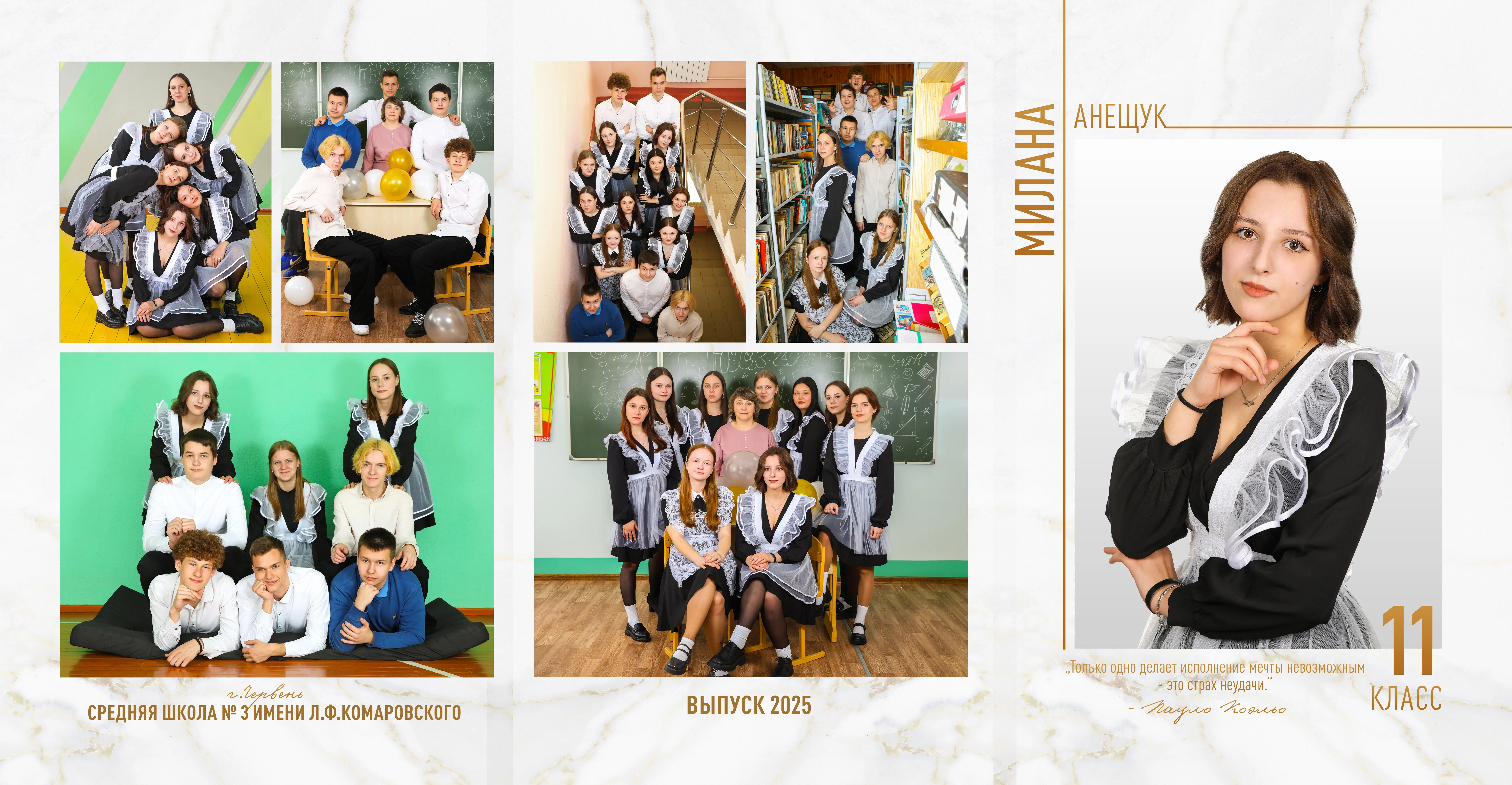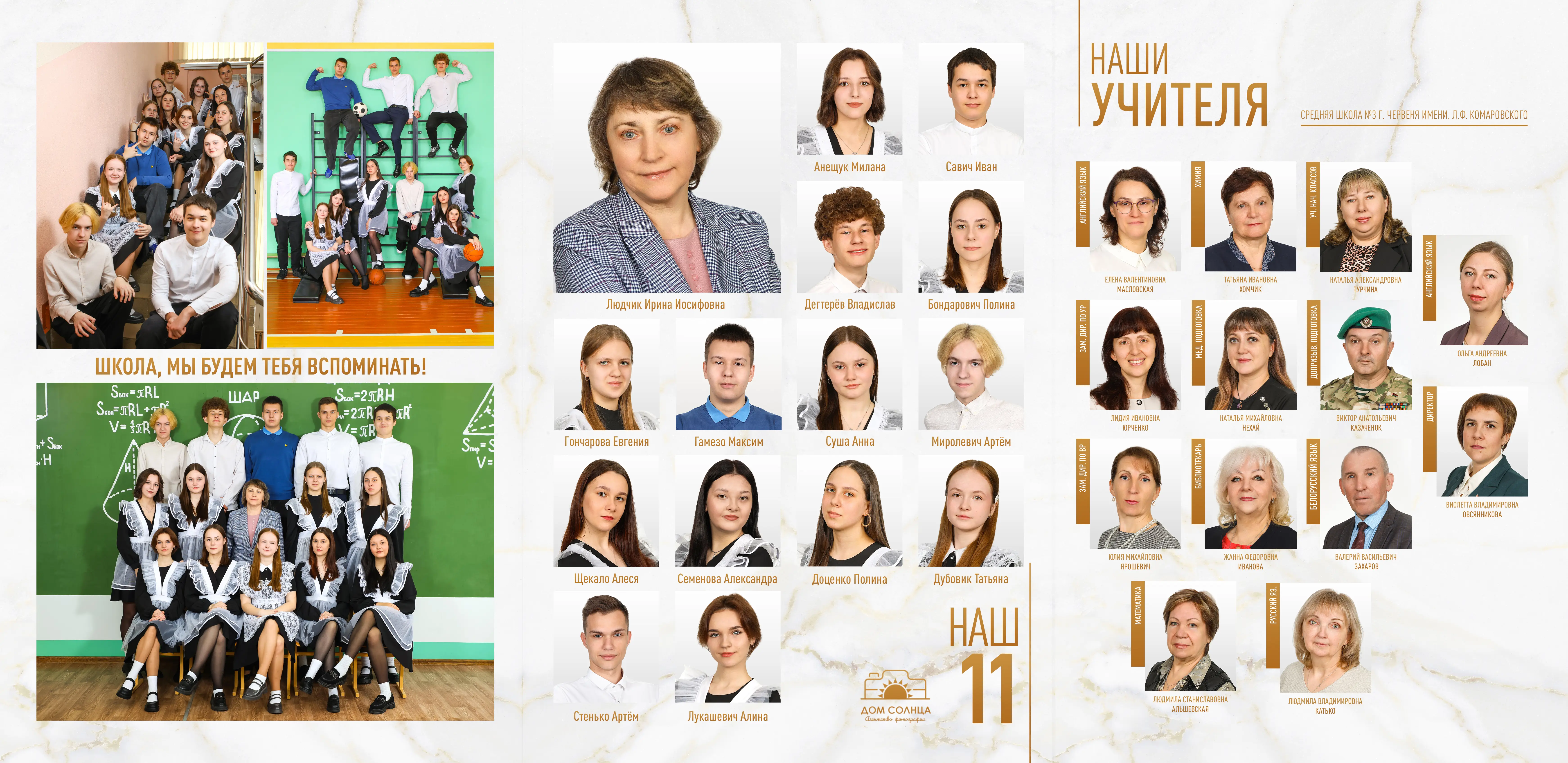 В трюмо входит: 2 портрета (1 на обложке и 1 в виньетке), 1 общее фото всего класса, 1 общее фото девочек, 1 общее фото мальчиков, 5-8 сюжетных кадров (в зависимости от численности класса).