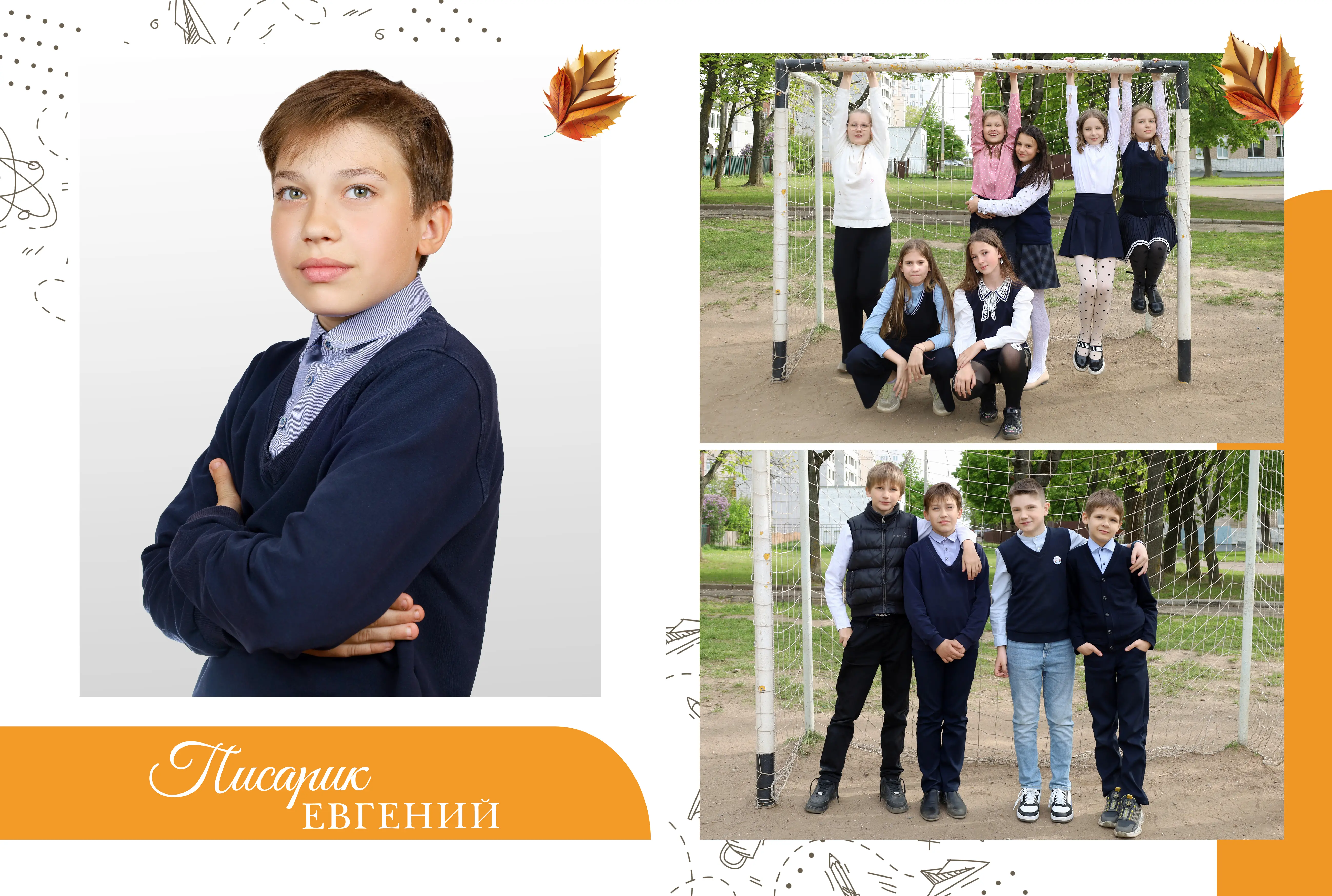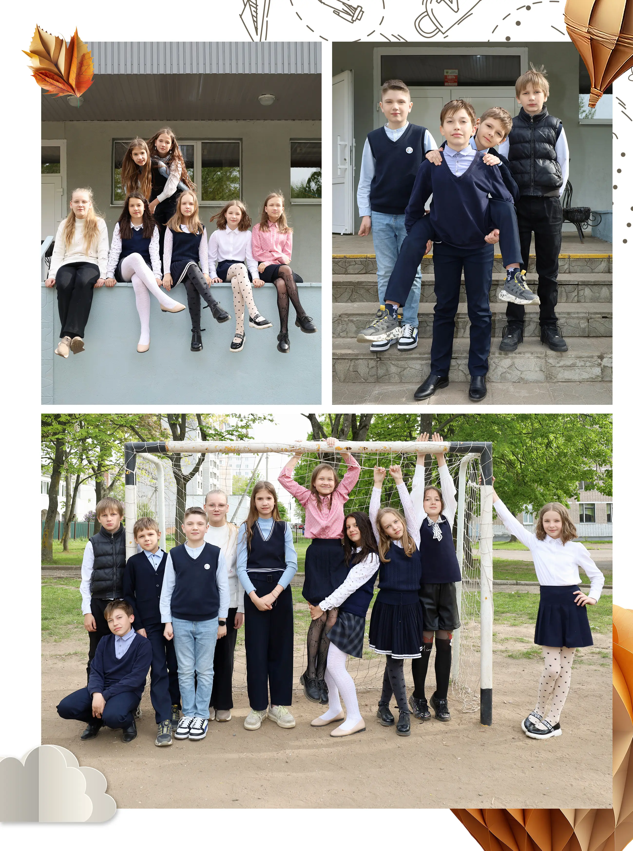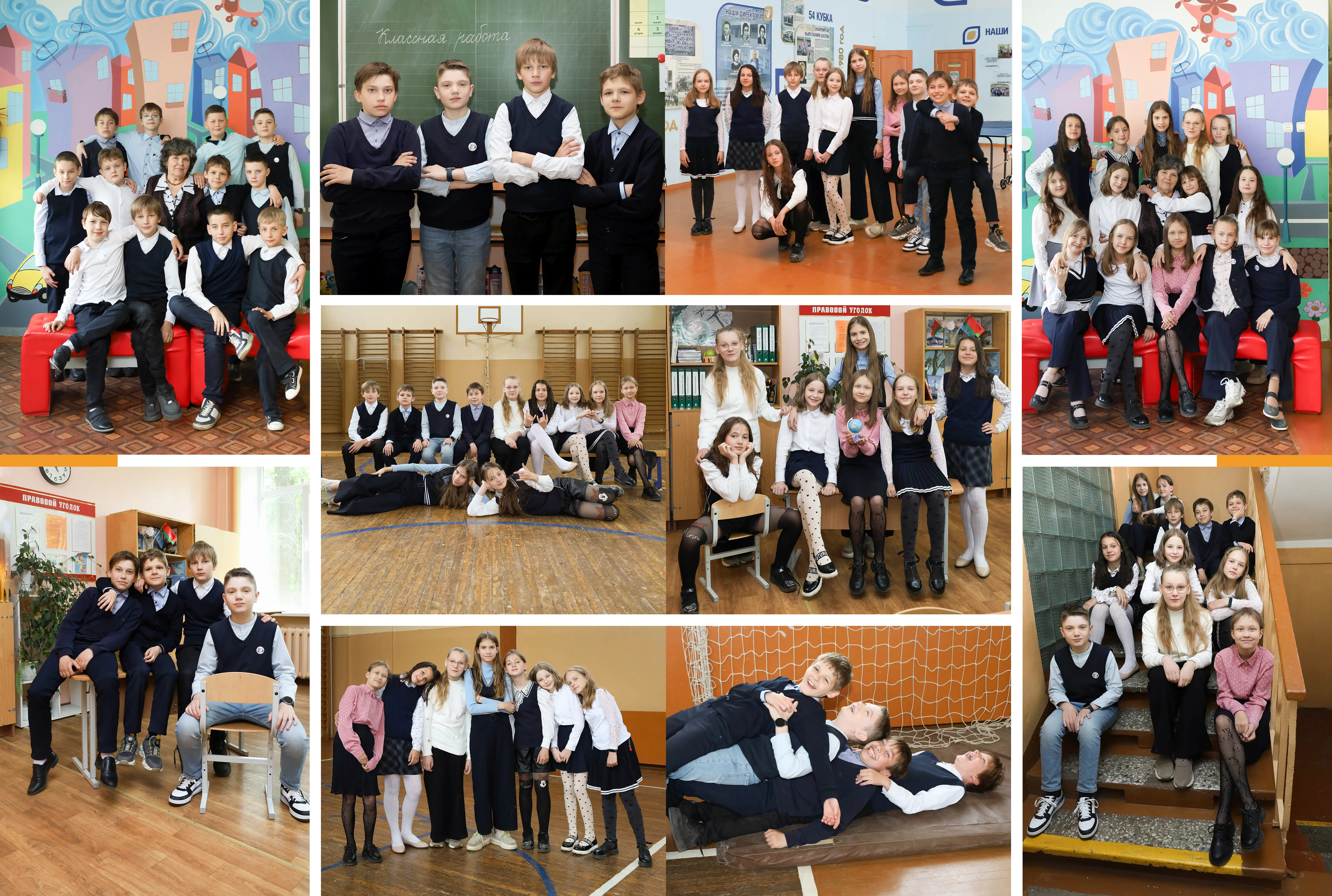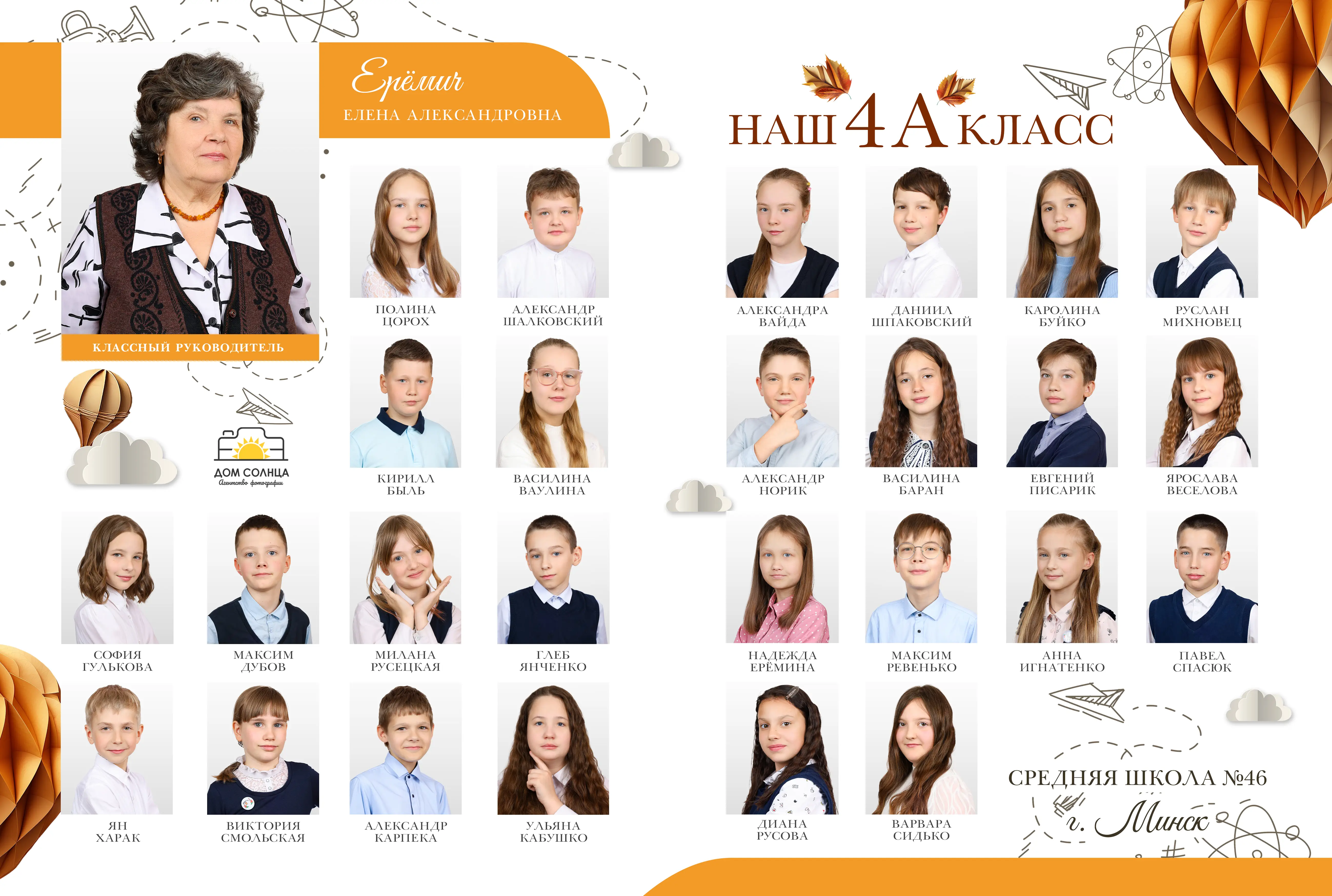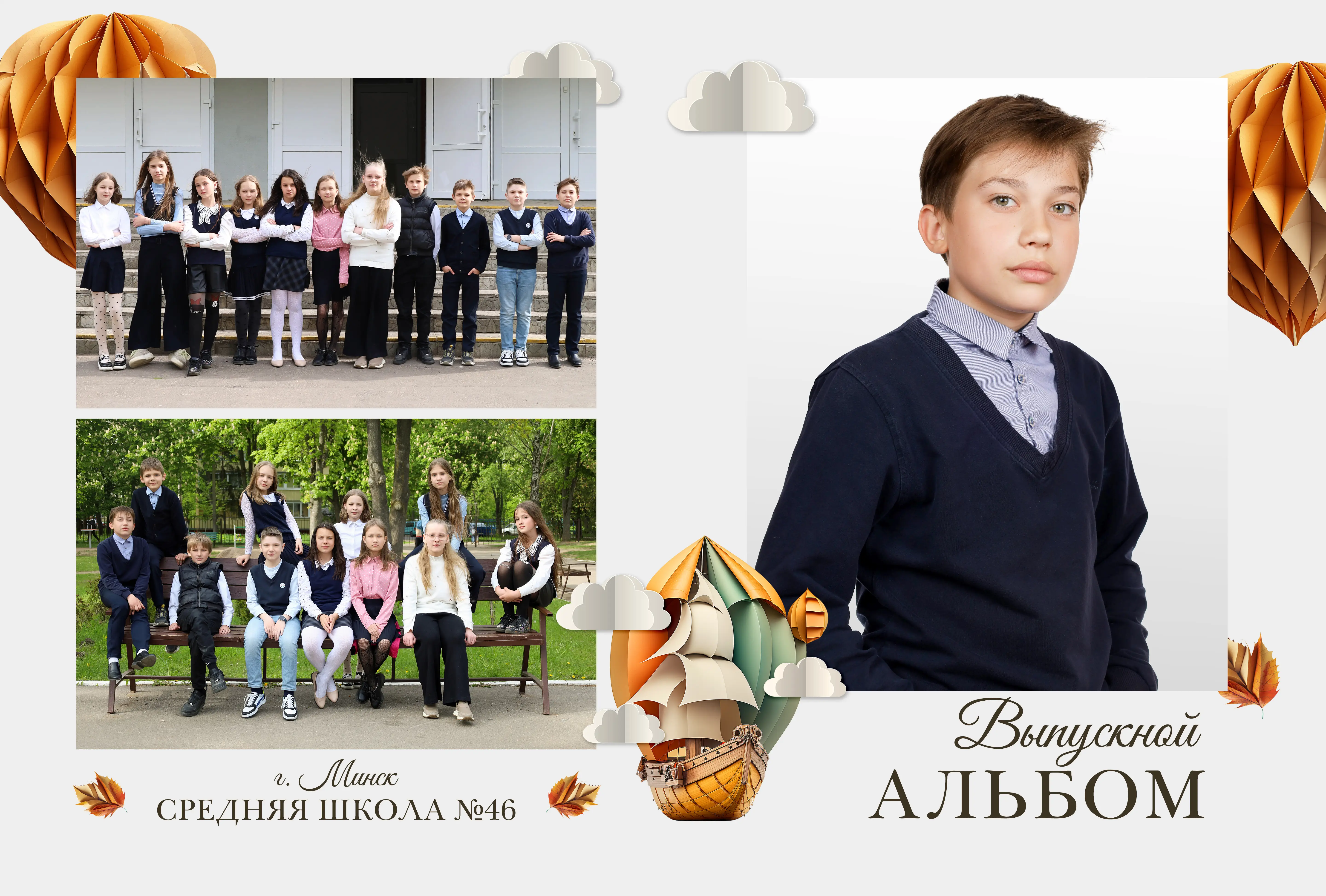 В альбом входит: 2-3 портрета (на обложке, внутри альбома, в виньетке), 1 общее фото всего класса, 1 общее фото девочек, 1 общее фото мальчиков, 15-20 сюжетных кадров (в зависимости от численности класса).
