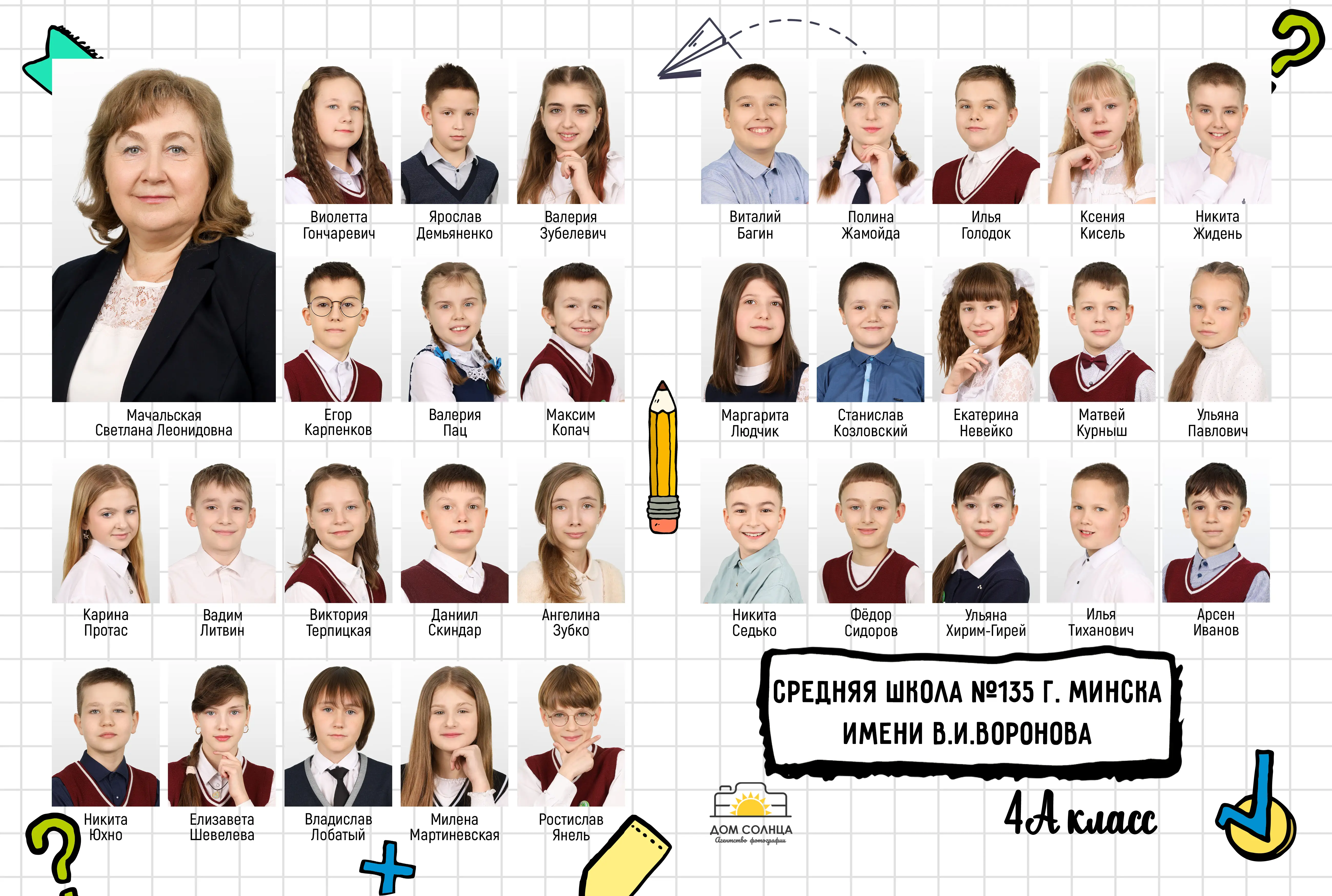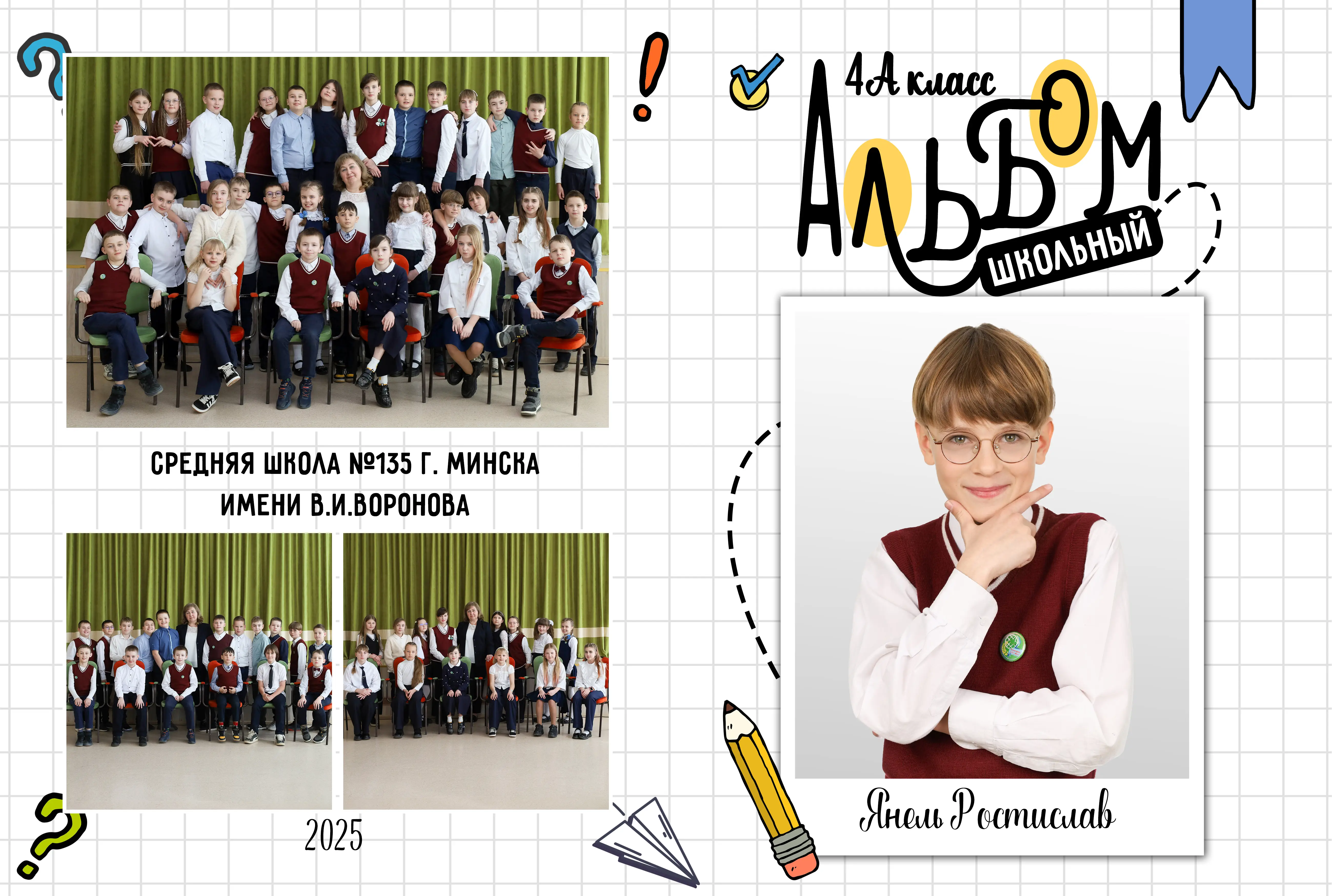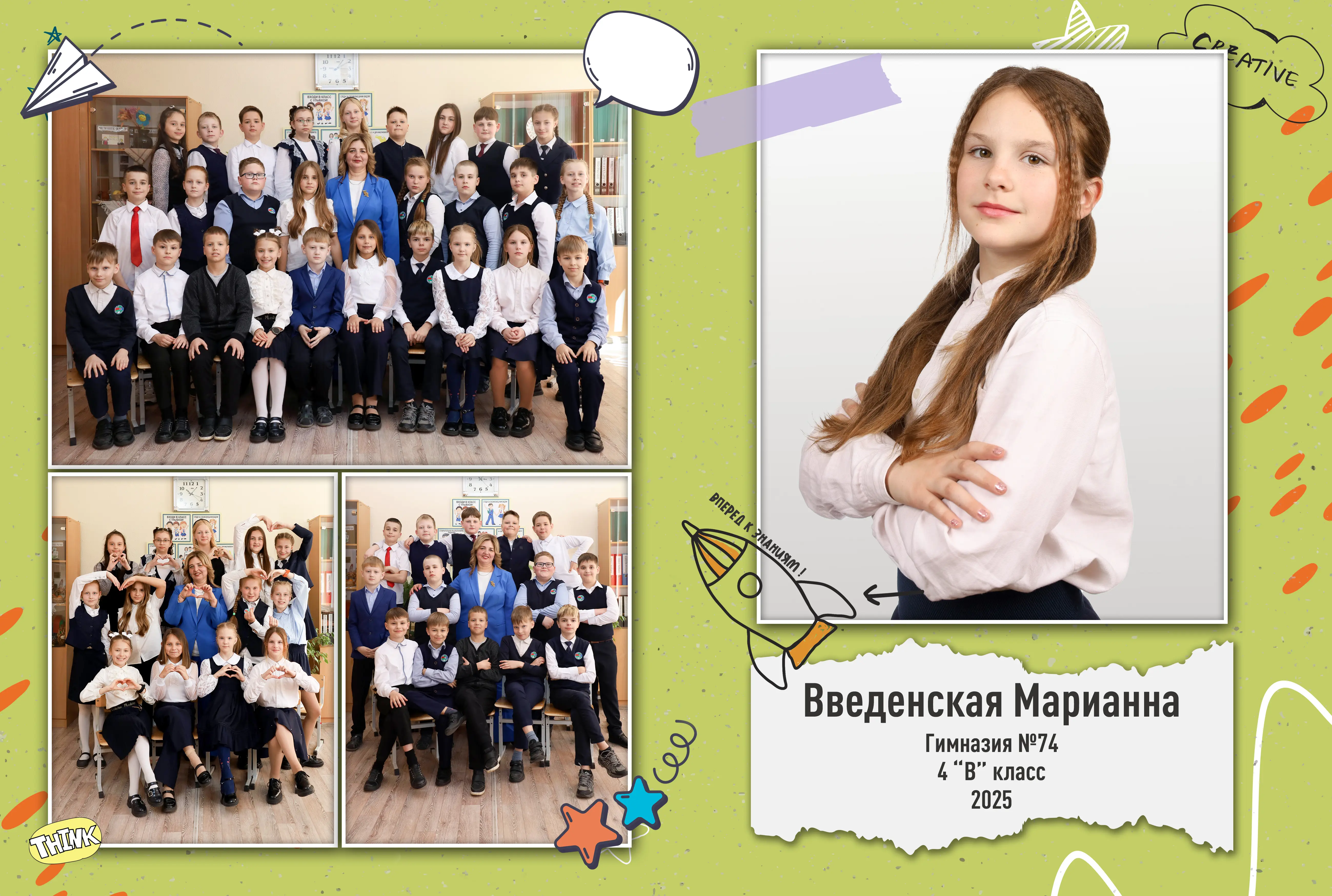 В разворот входит: 2 портрета (1 на обложке и 1 в виньетке), 1 общее фото всего класса, 1 общее фото девочек и 1 общее фото мальчиков.