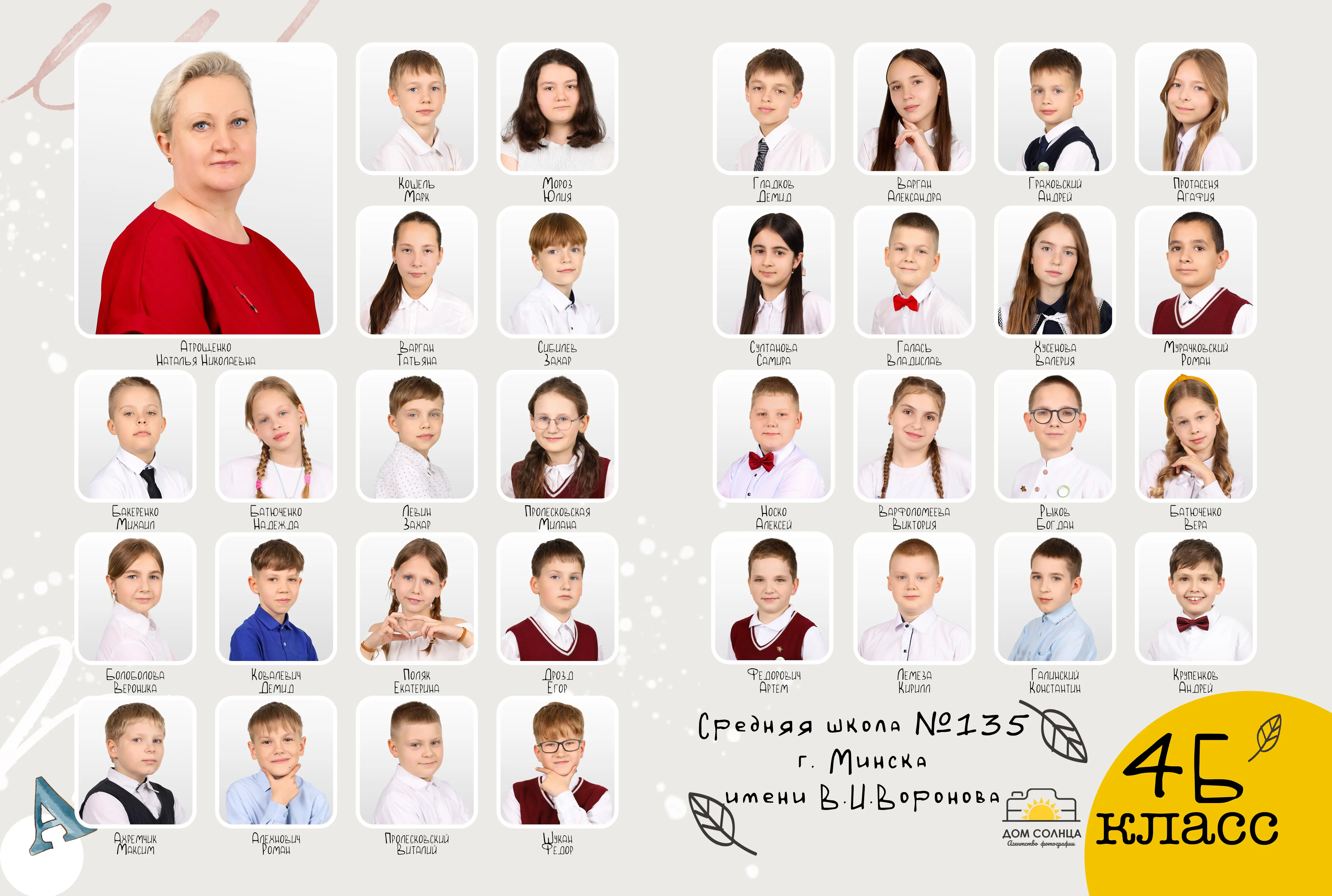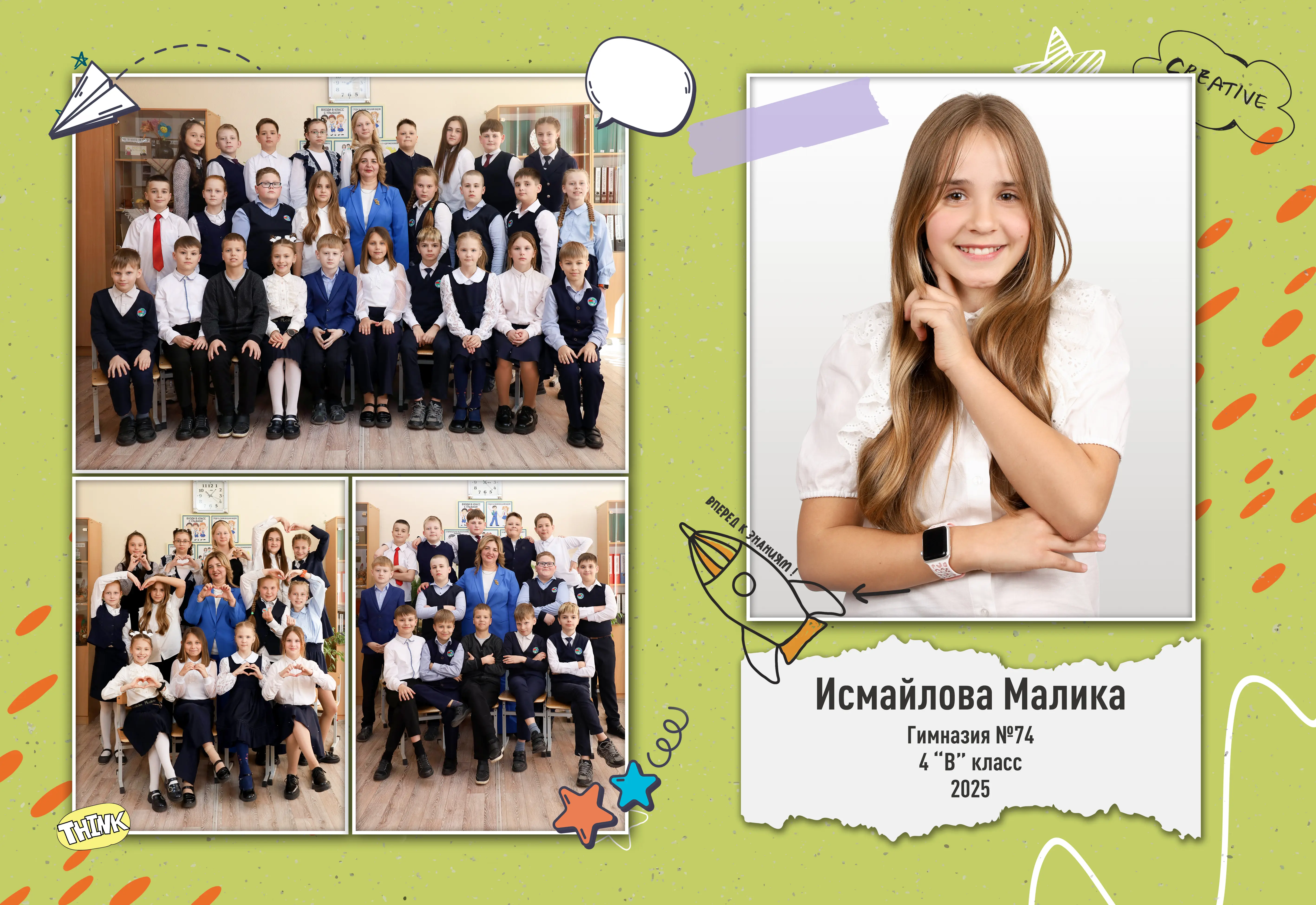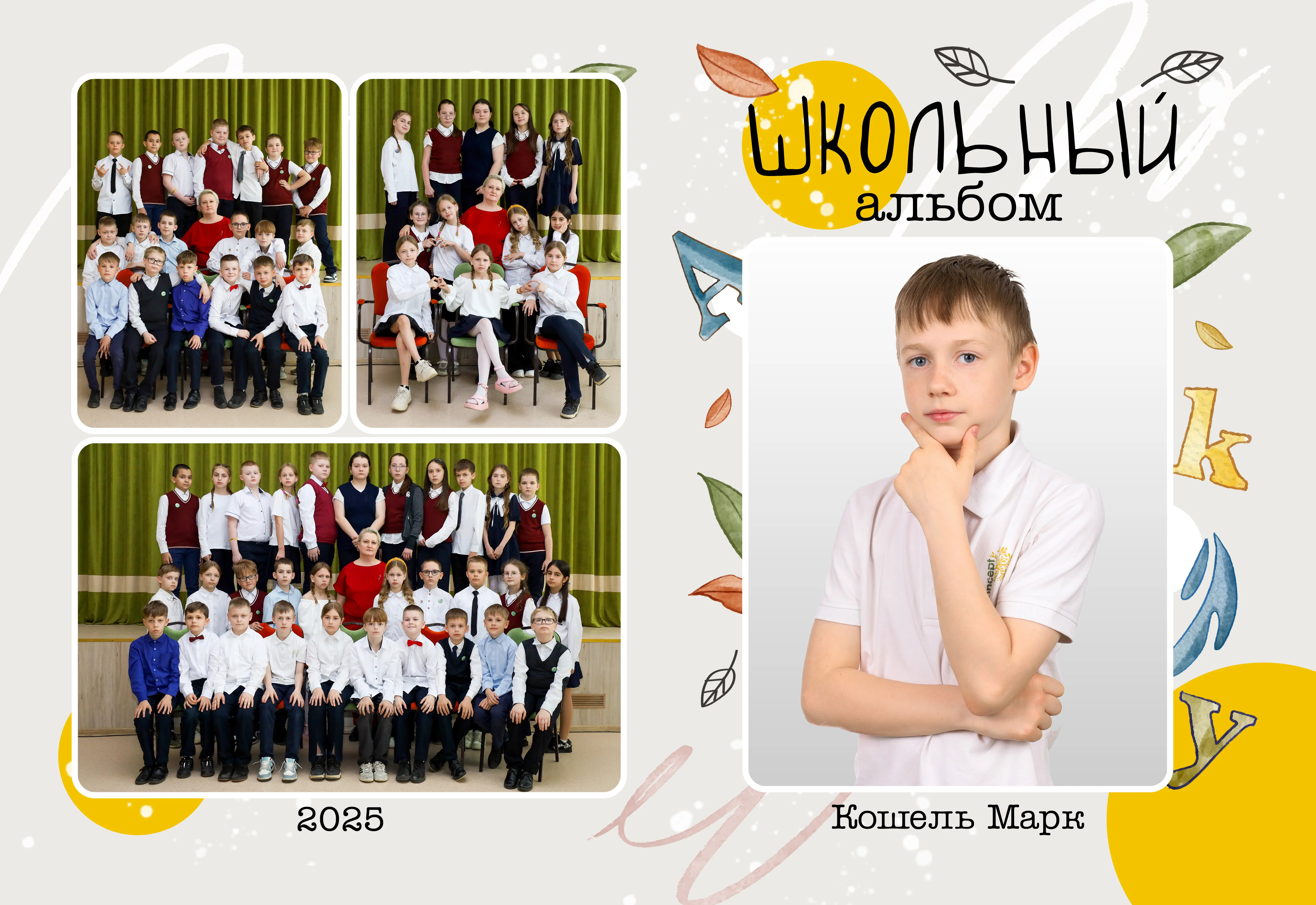 В разворот входит: 2 портрета (1 на обложке и 1 в виньетке), 1 общее фото всего класса, 1 общее фото девочек и 1 общее фото мальчиков.