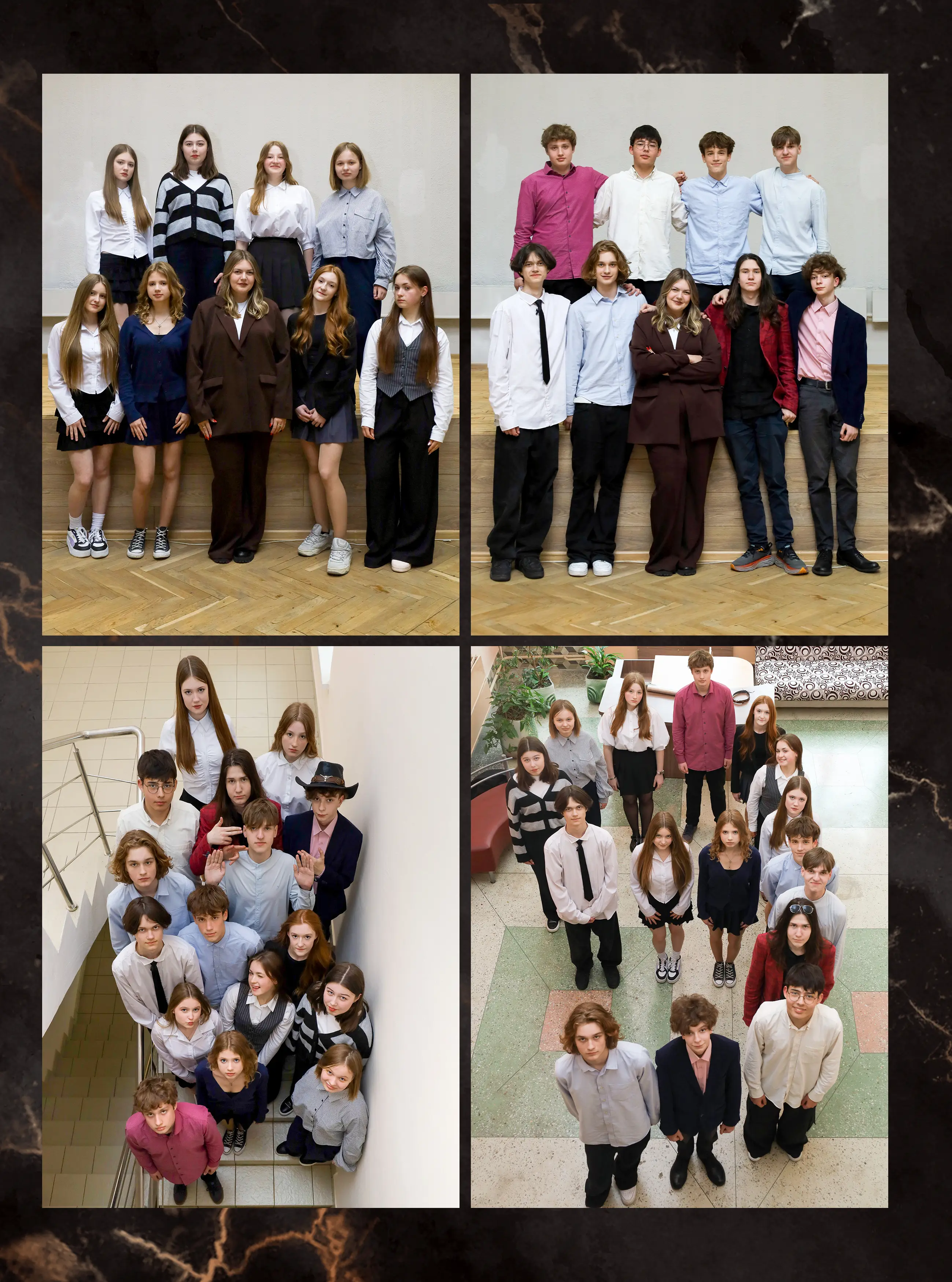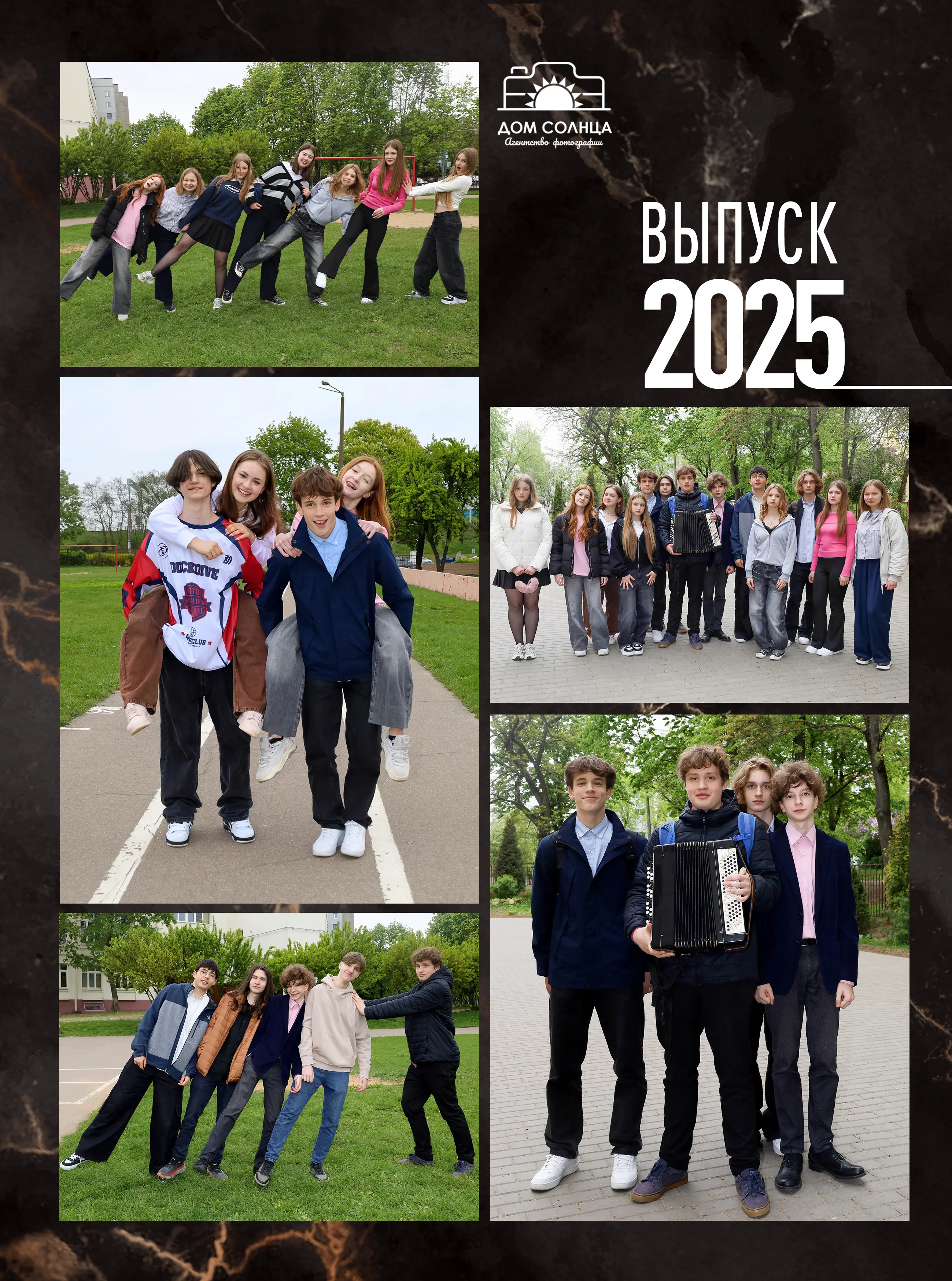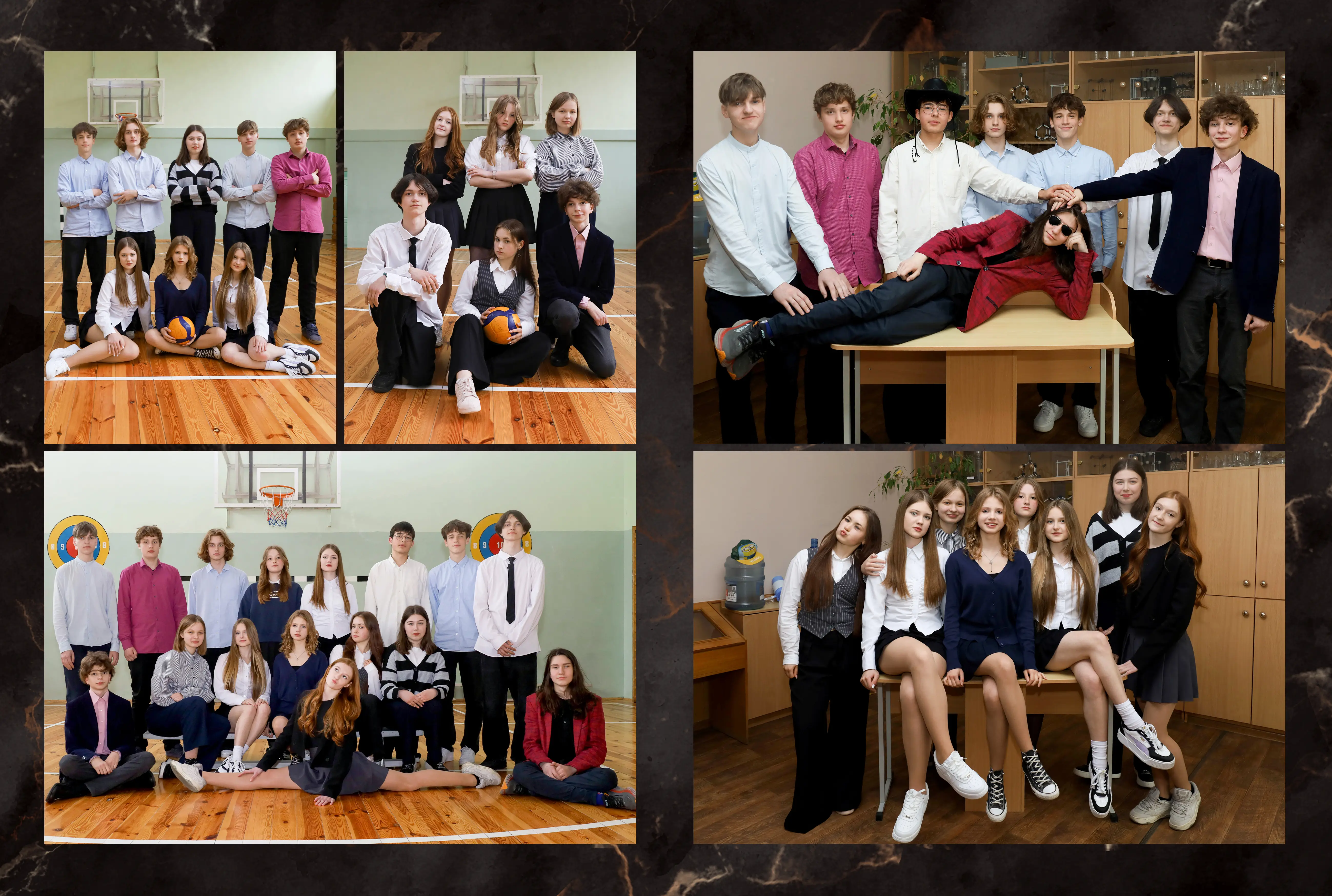 В альбом входит: 2-3 портрета (на обложке, внутри альбома, в виньетке), 1 общее фото всего класса, 1 общее фото девочек, 1 общее фото мальчиков, 25-35 сюжетных кадров (в зависимости от численности класса).