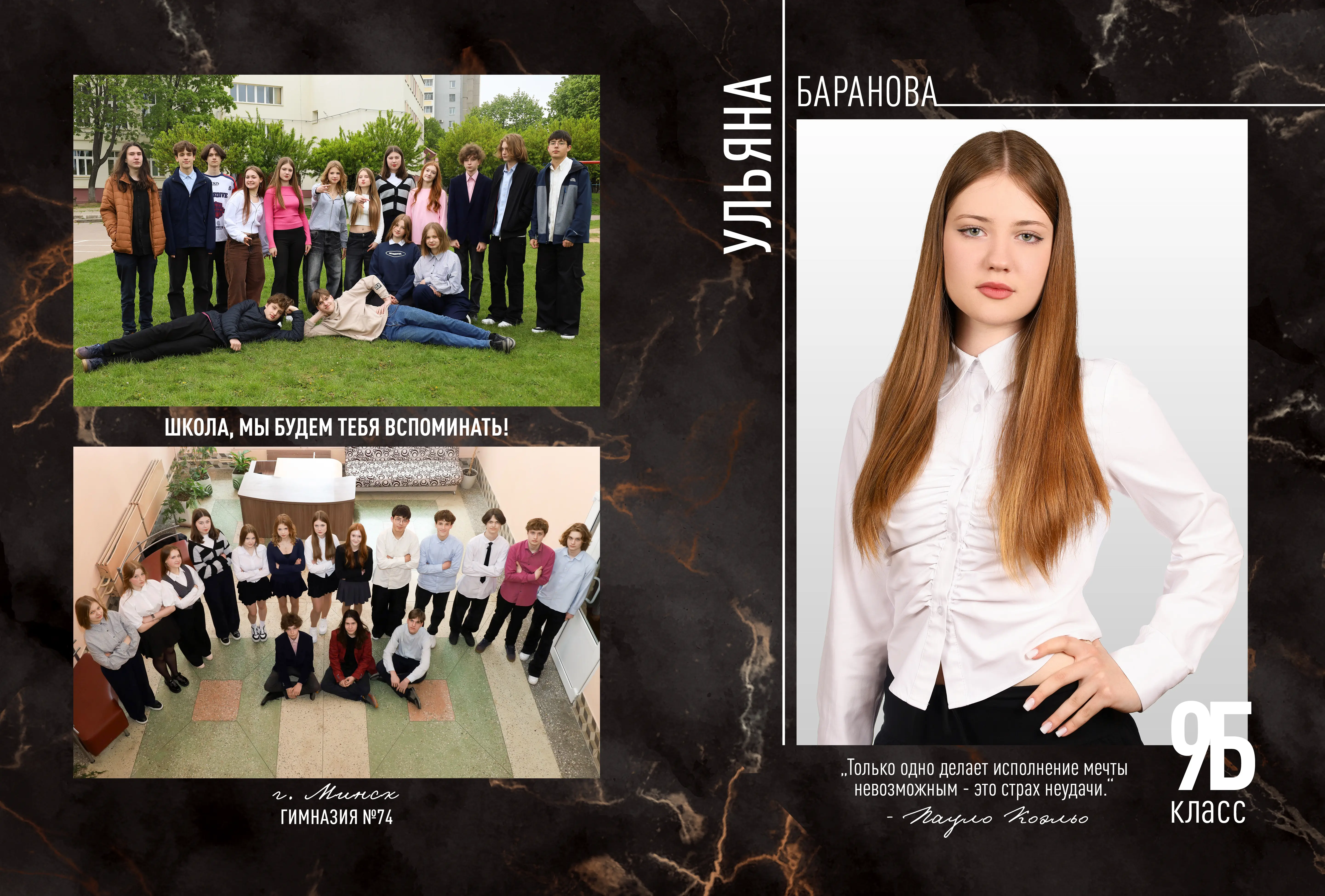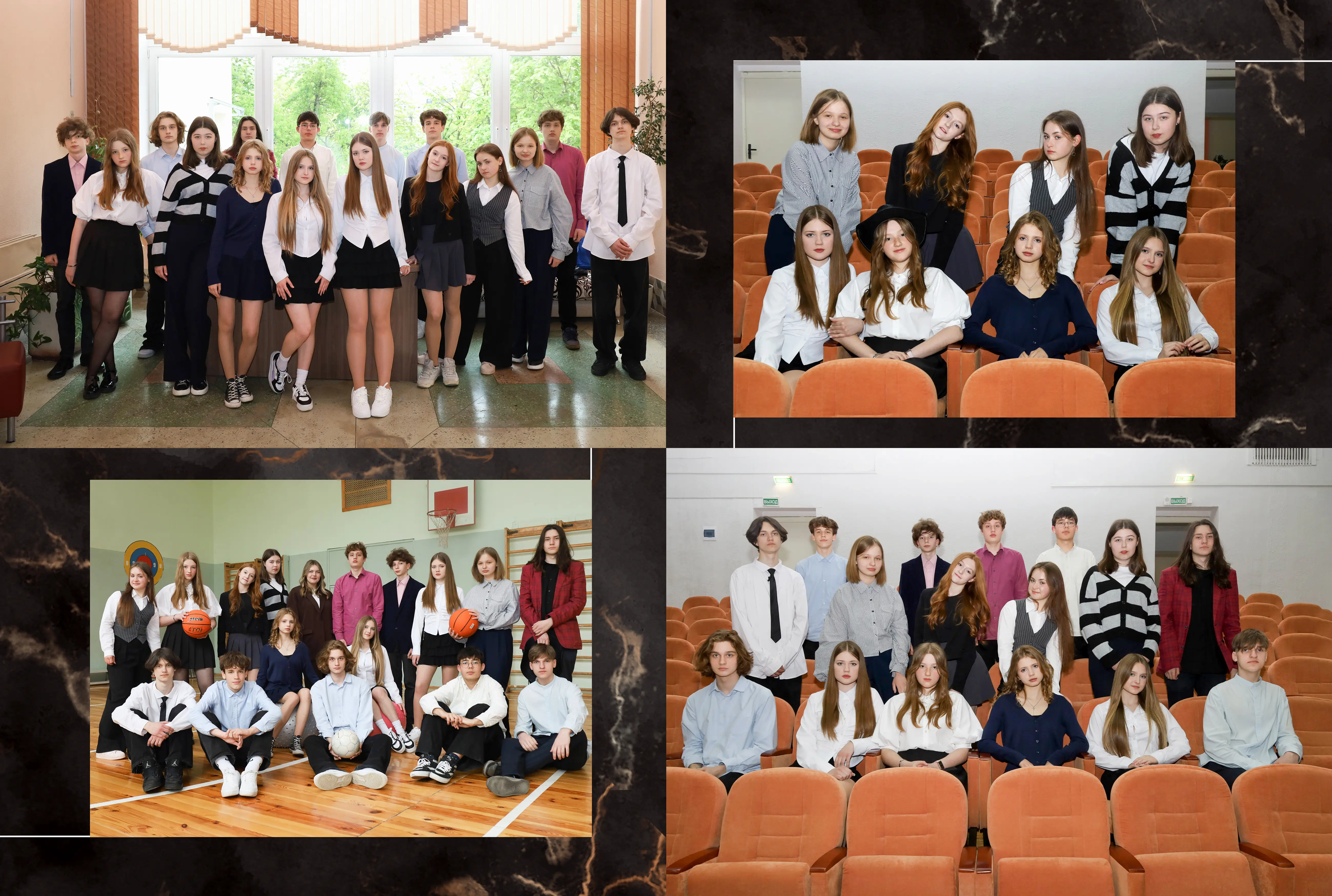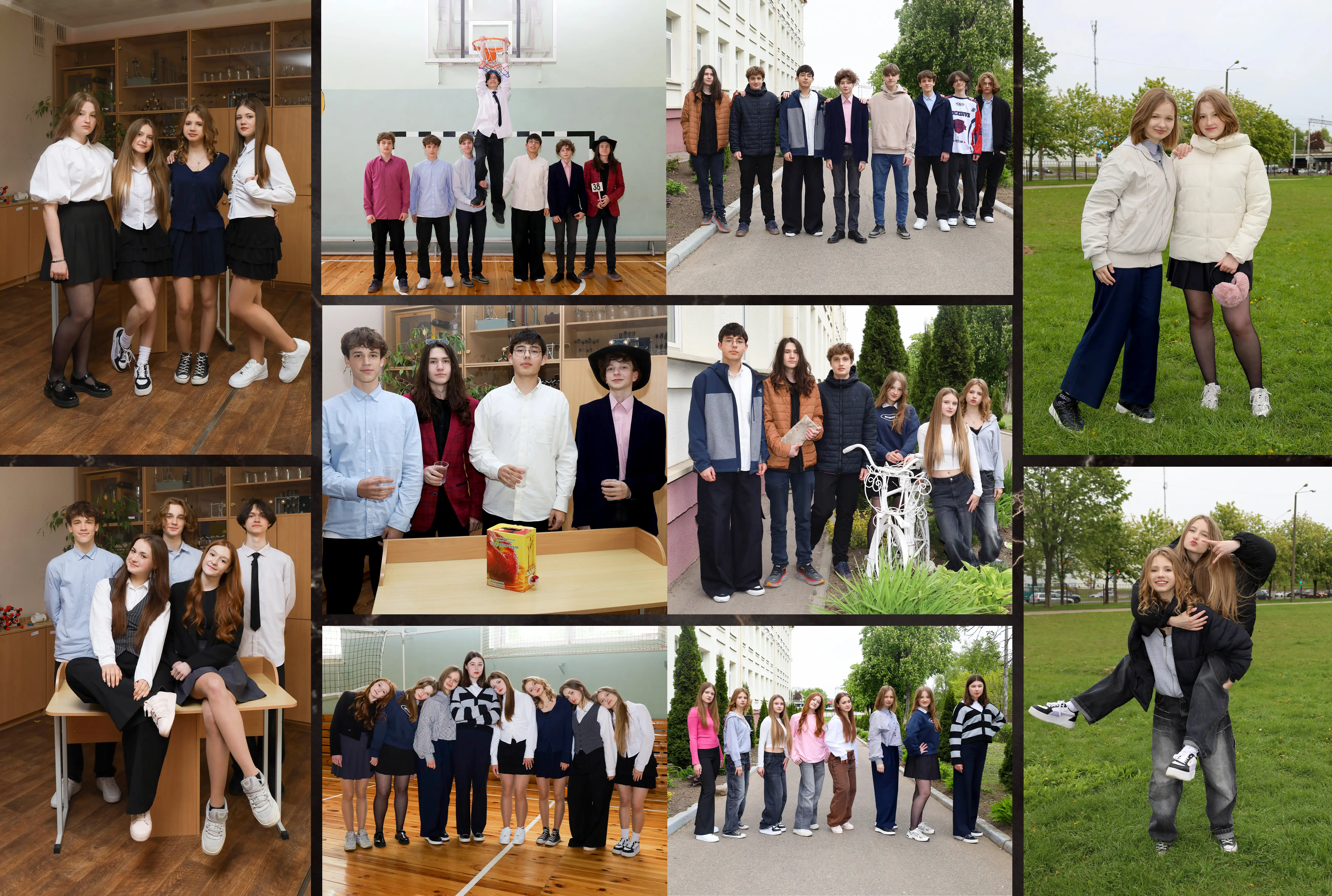 В альбом входит: 2-3 портрета (на обложке, внутри альбома, в виньетке), 1 общее фото всего класса, 1 общее фото девочек, 1 общее фото мальчиков, 25-35 сюжетных кадров (в зависимости от численности класса).
