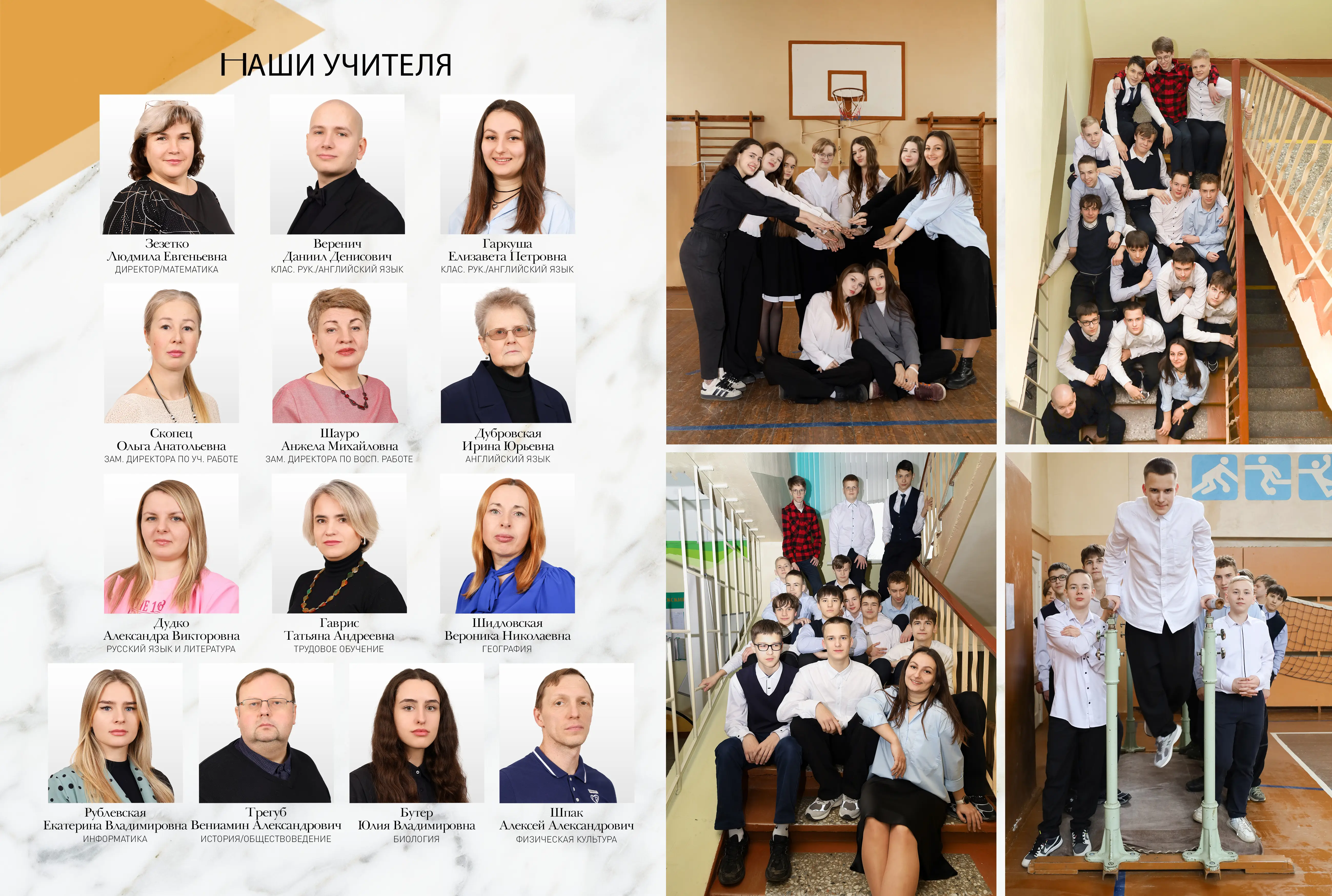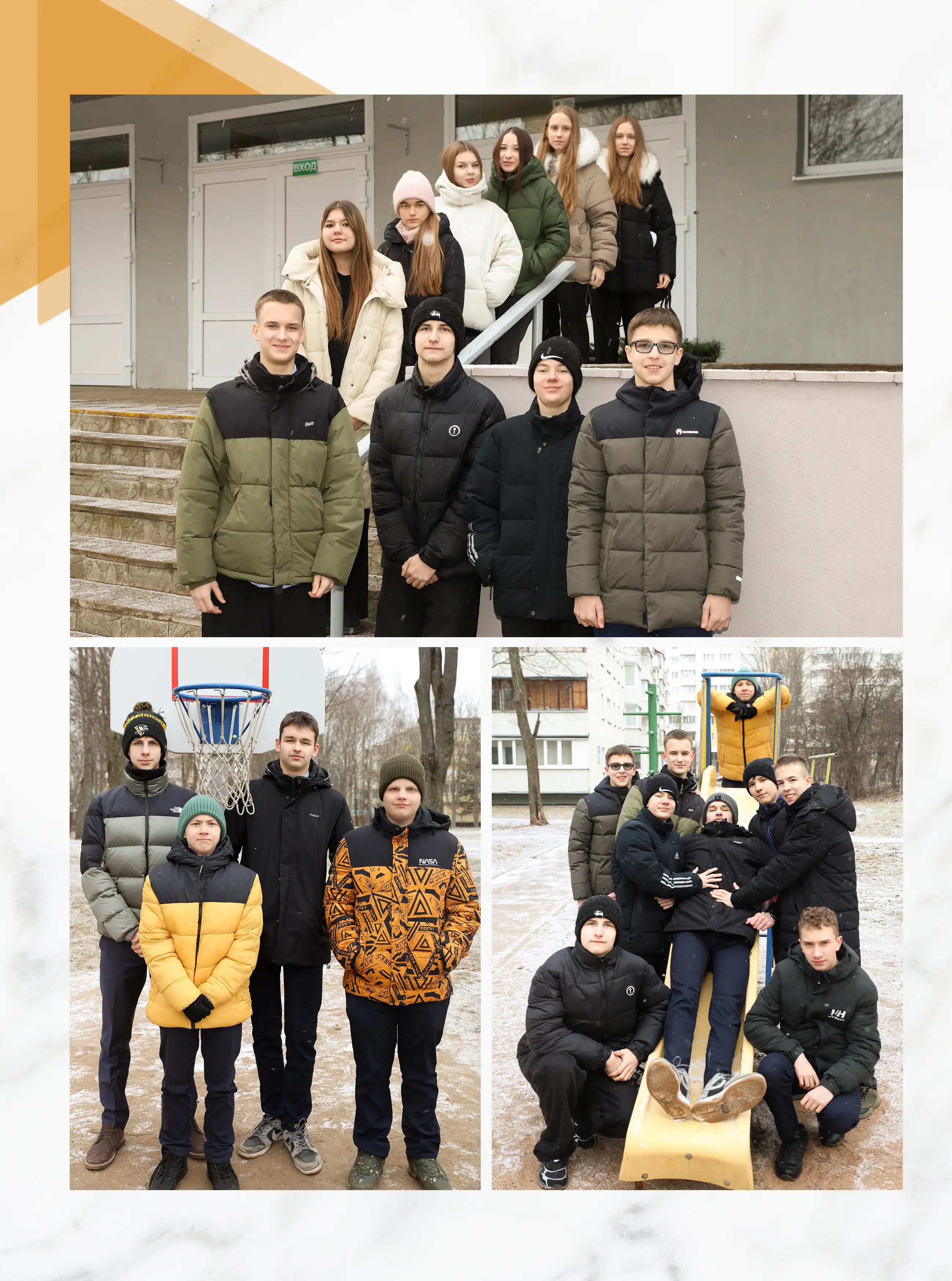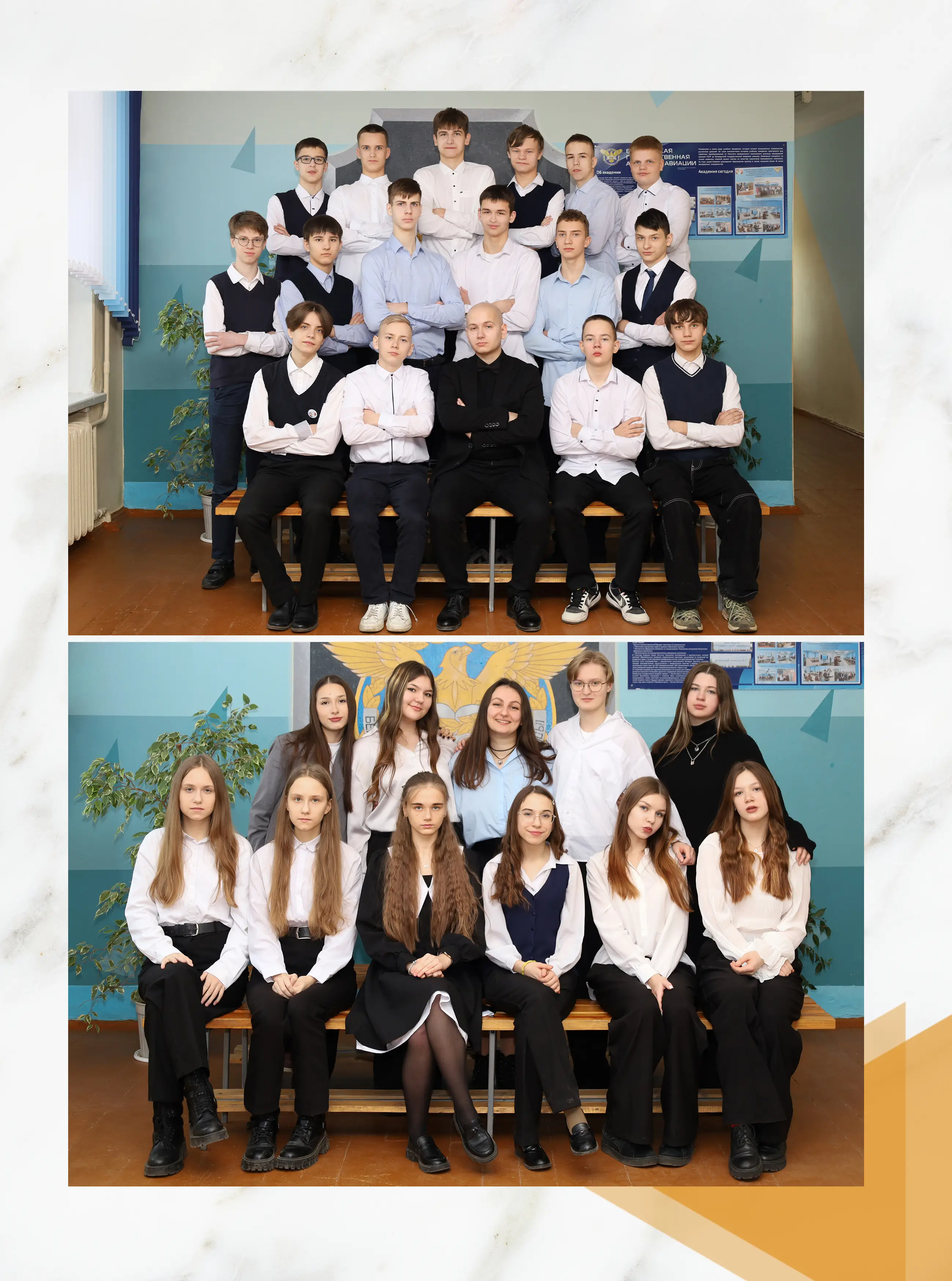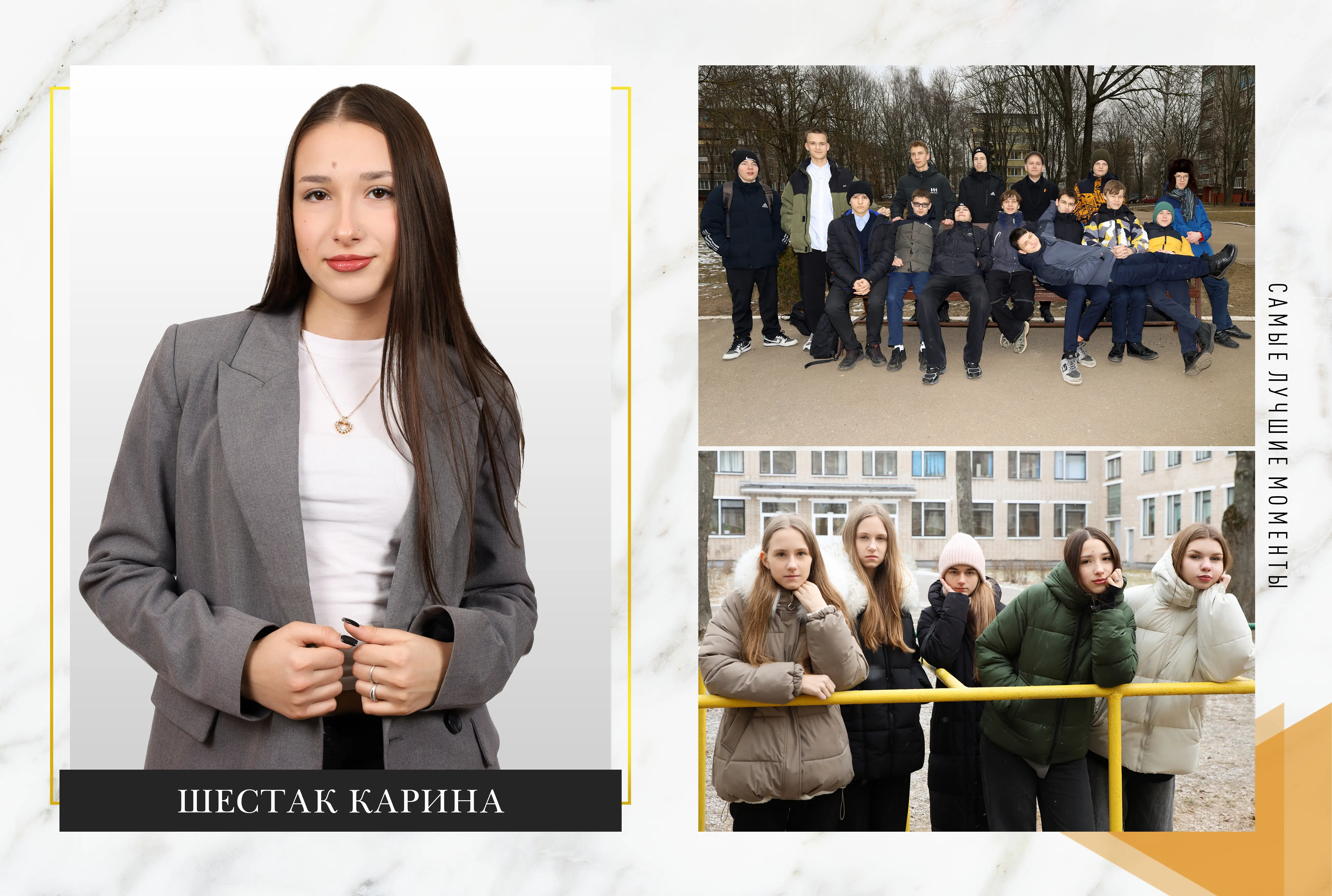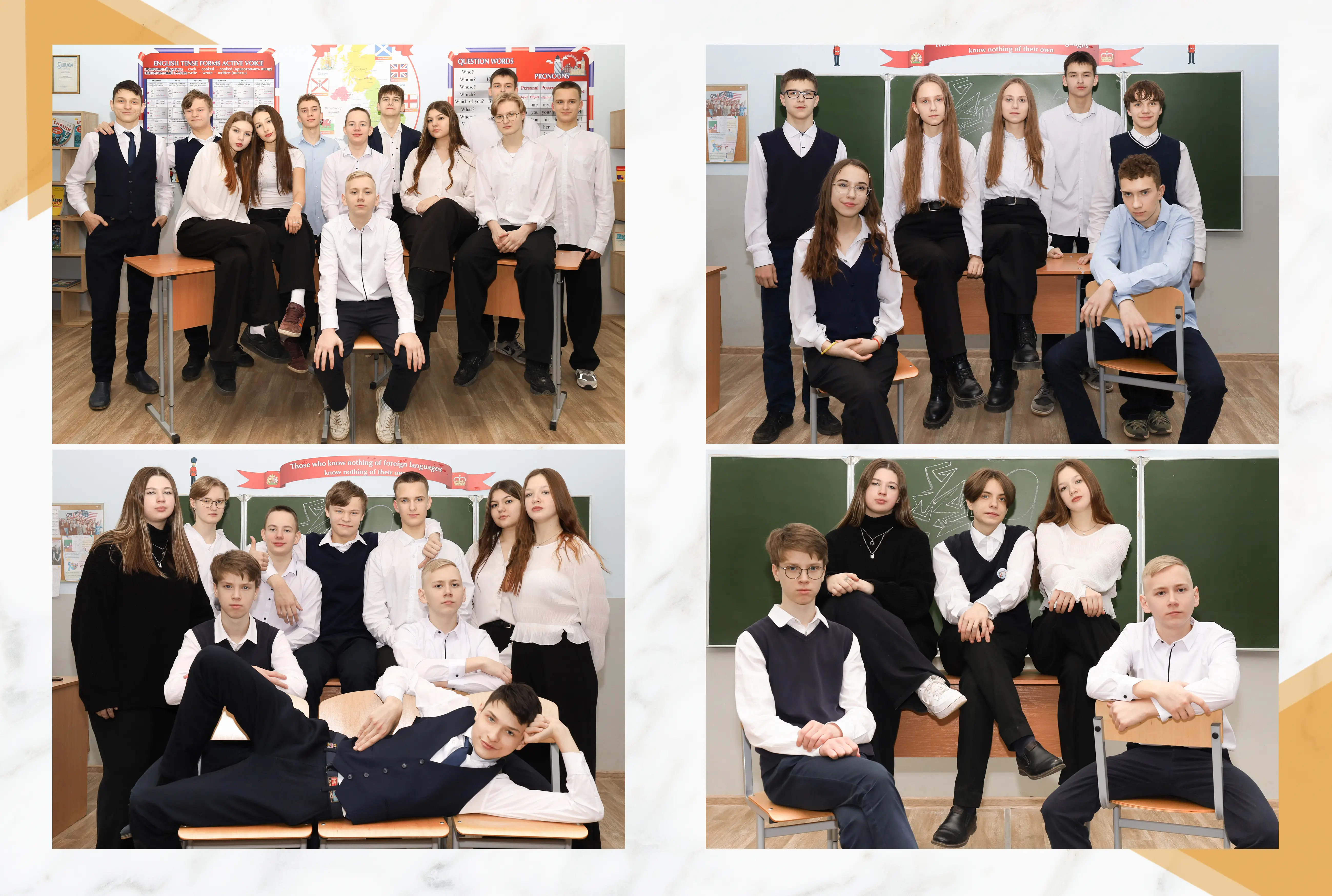 В альбом входит: 2-3 портрета (на обложке, внутри альбома, в виньетке), 1 общее фото всего класса, 1 общее фото девочек, 1 общее фото мальчиков, 25-35 сюжетных кадров (в зависимости от численности класса).