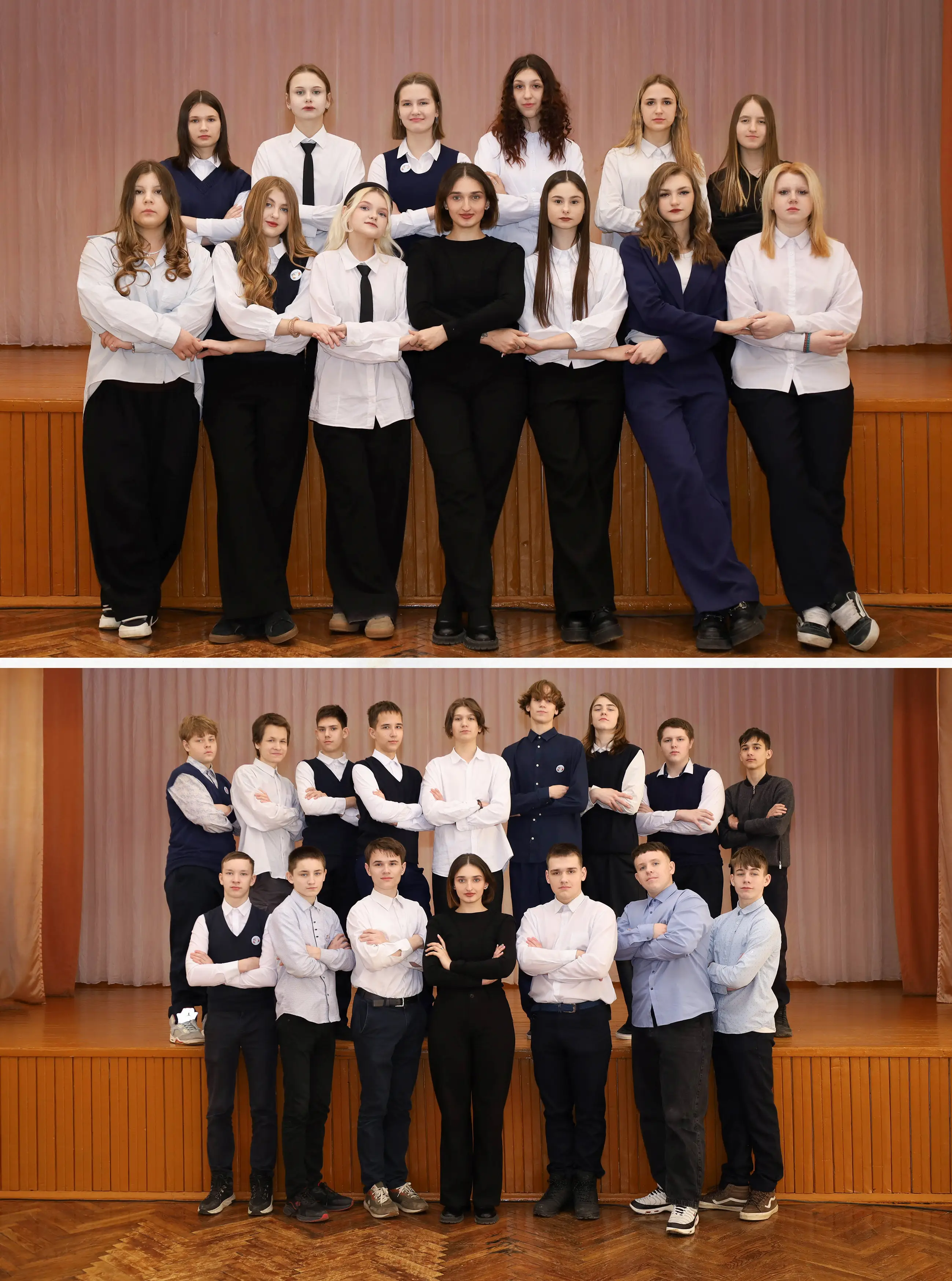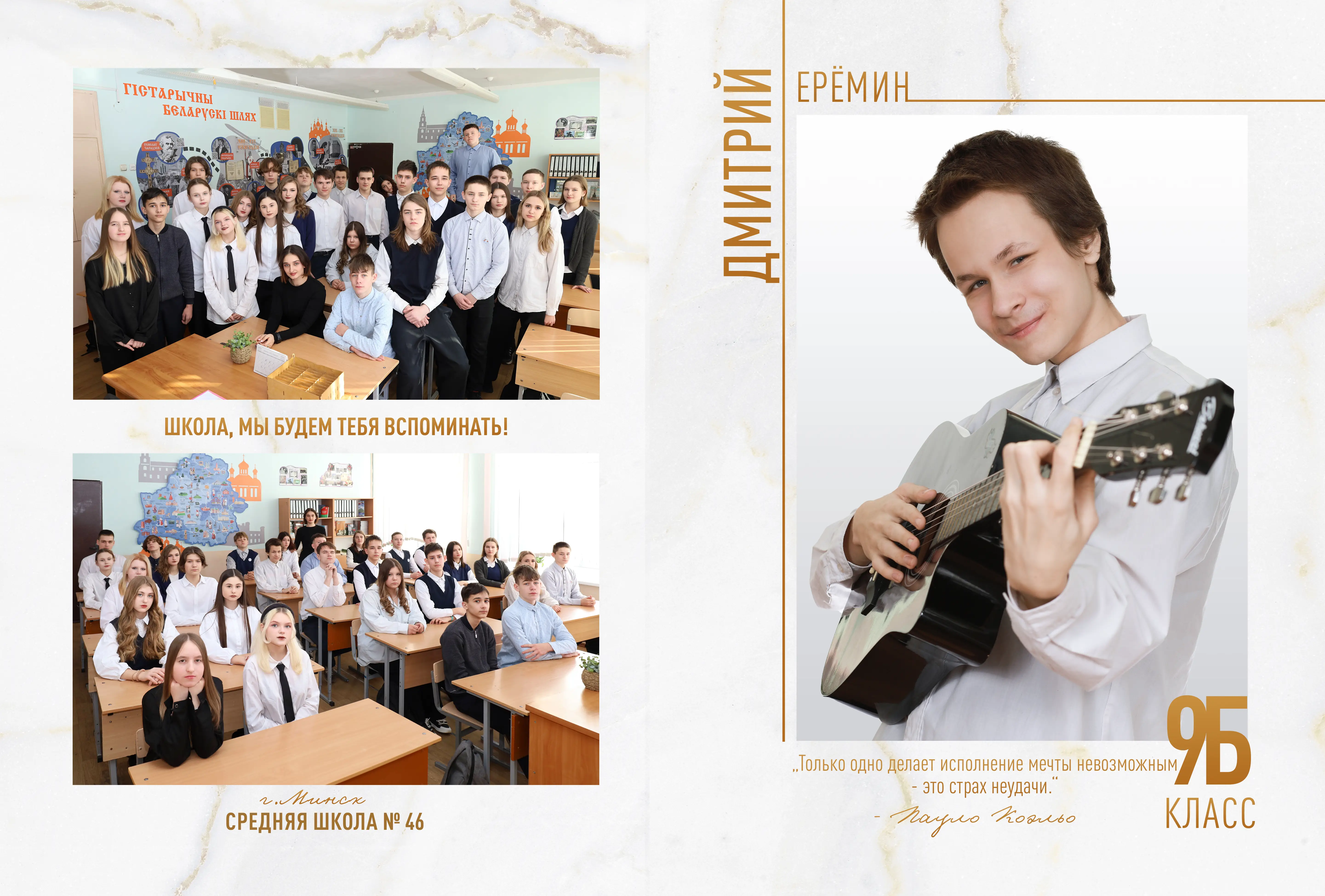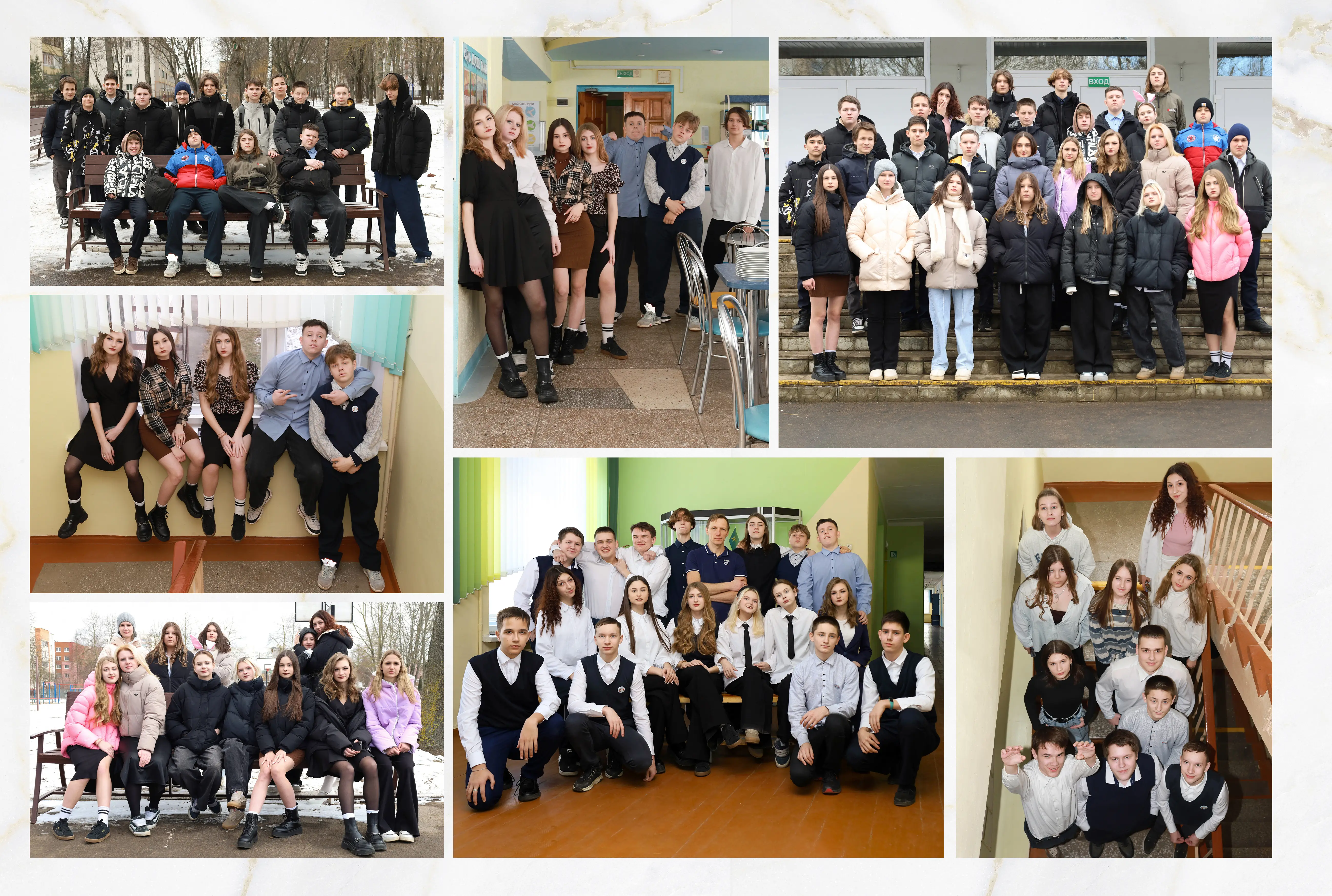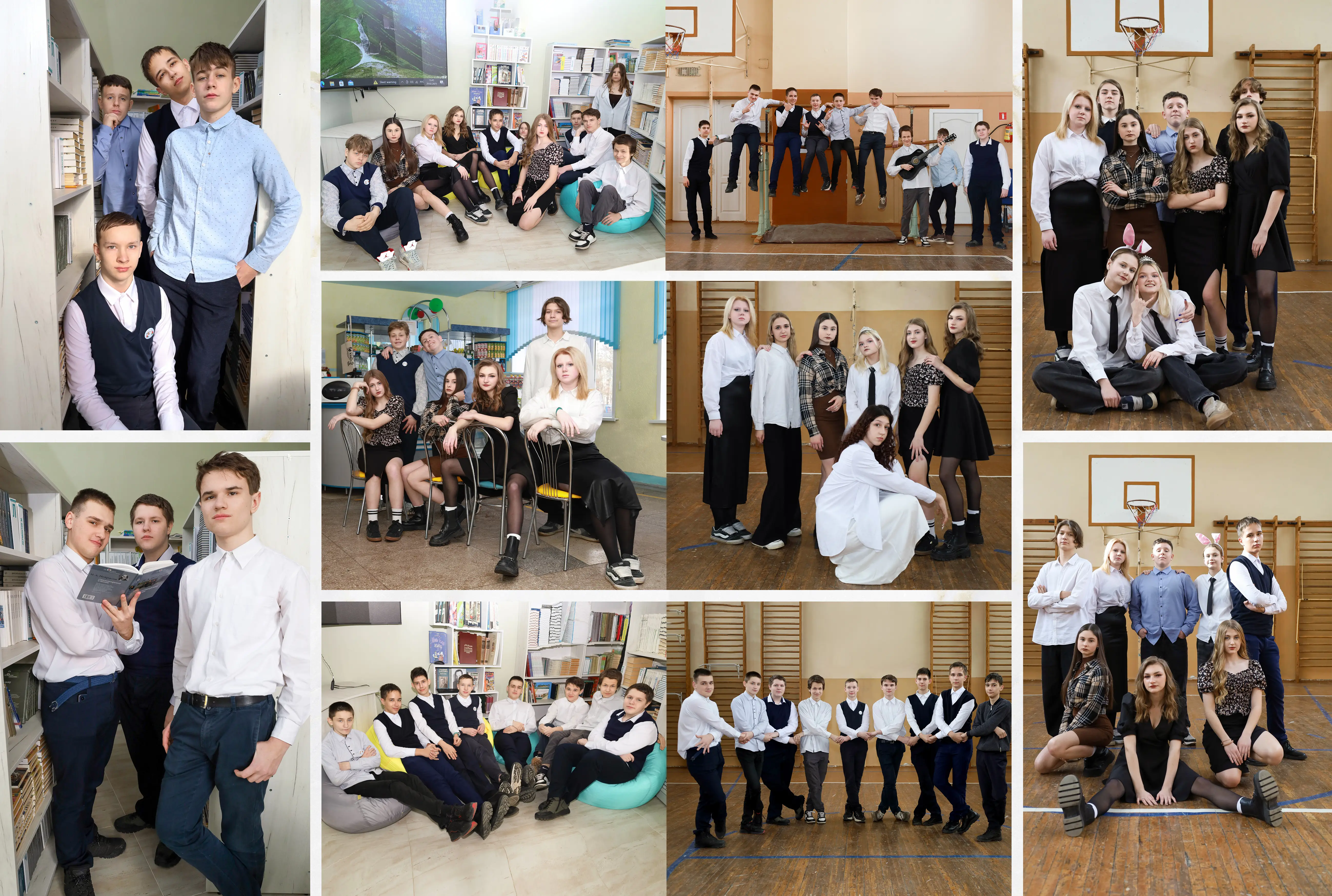 В альбом входит: 2-3 портрета (на обложке, внутри альбома, в виньетке), 1 общее фото всего класса, 1 общее фото девочек, 1 общее фото мальчиков, 15-20 сюжетных кадров (в зависимости от численности класса).