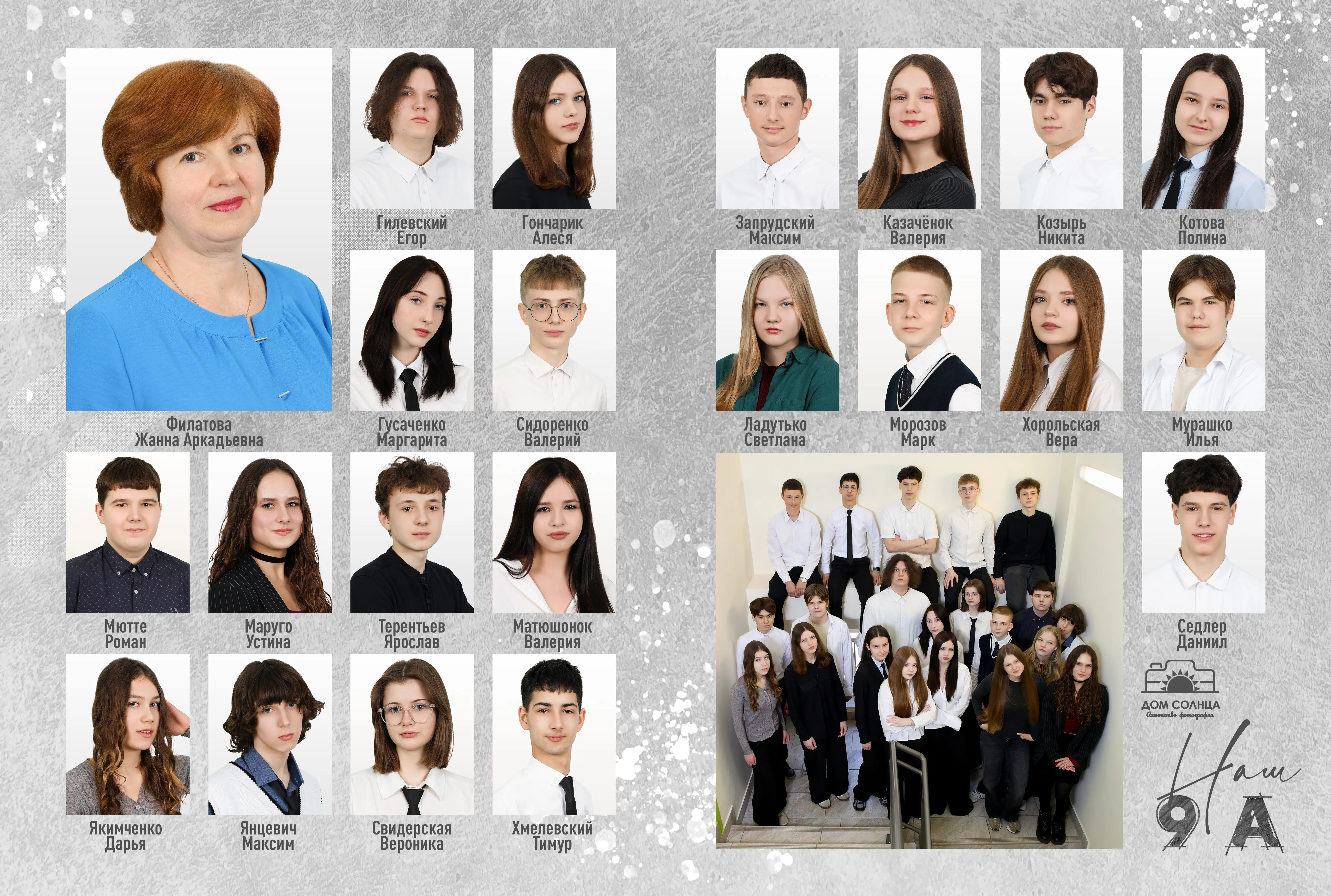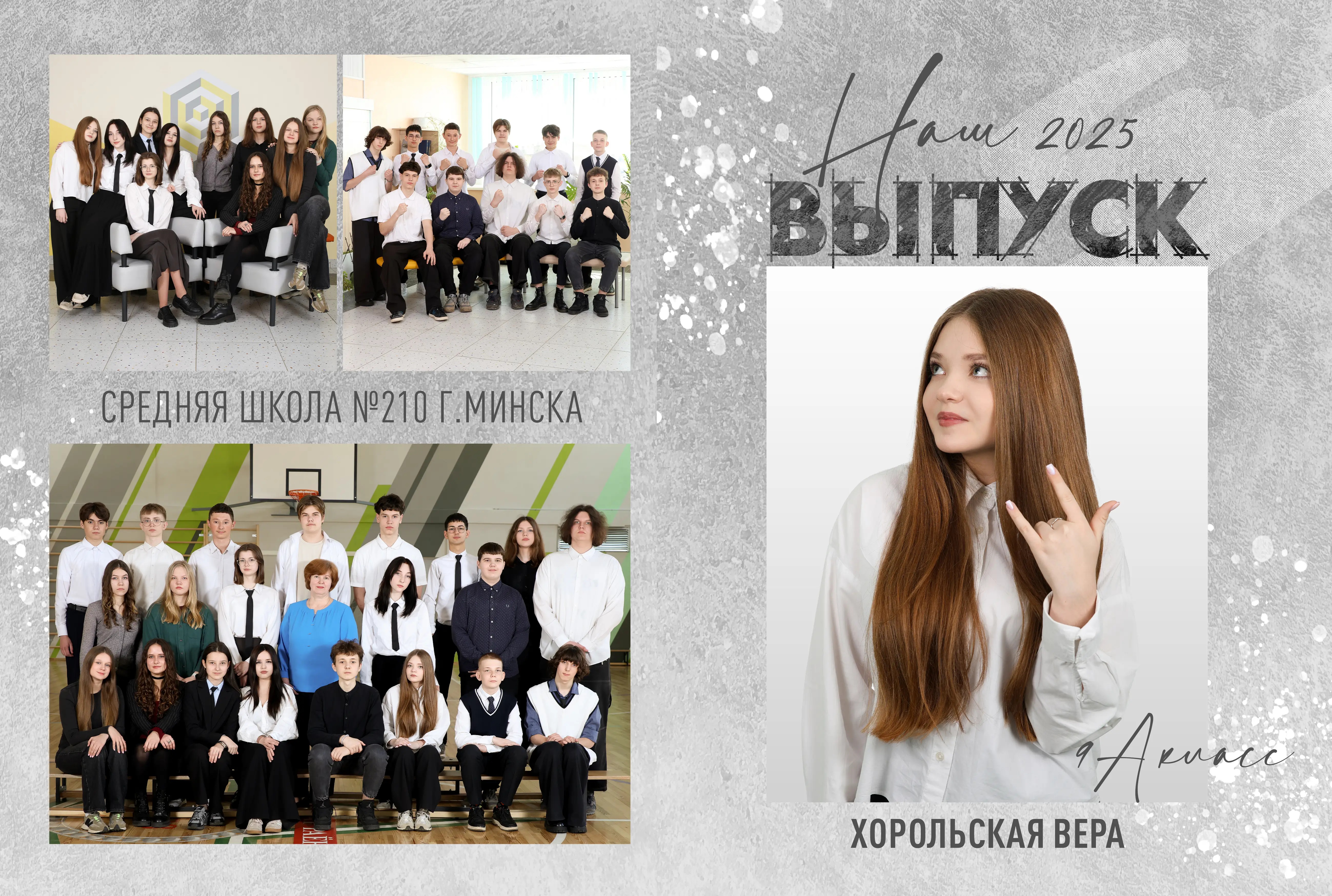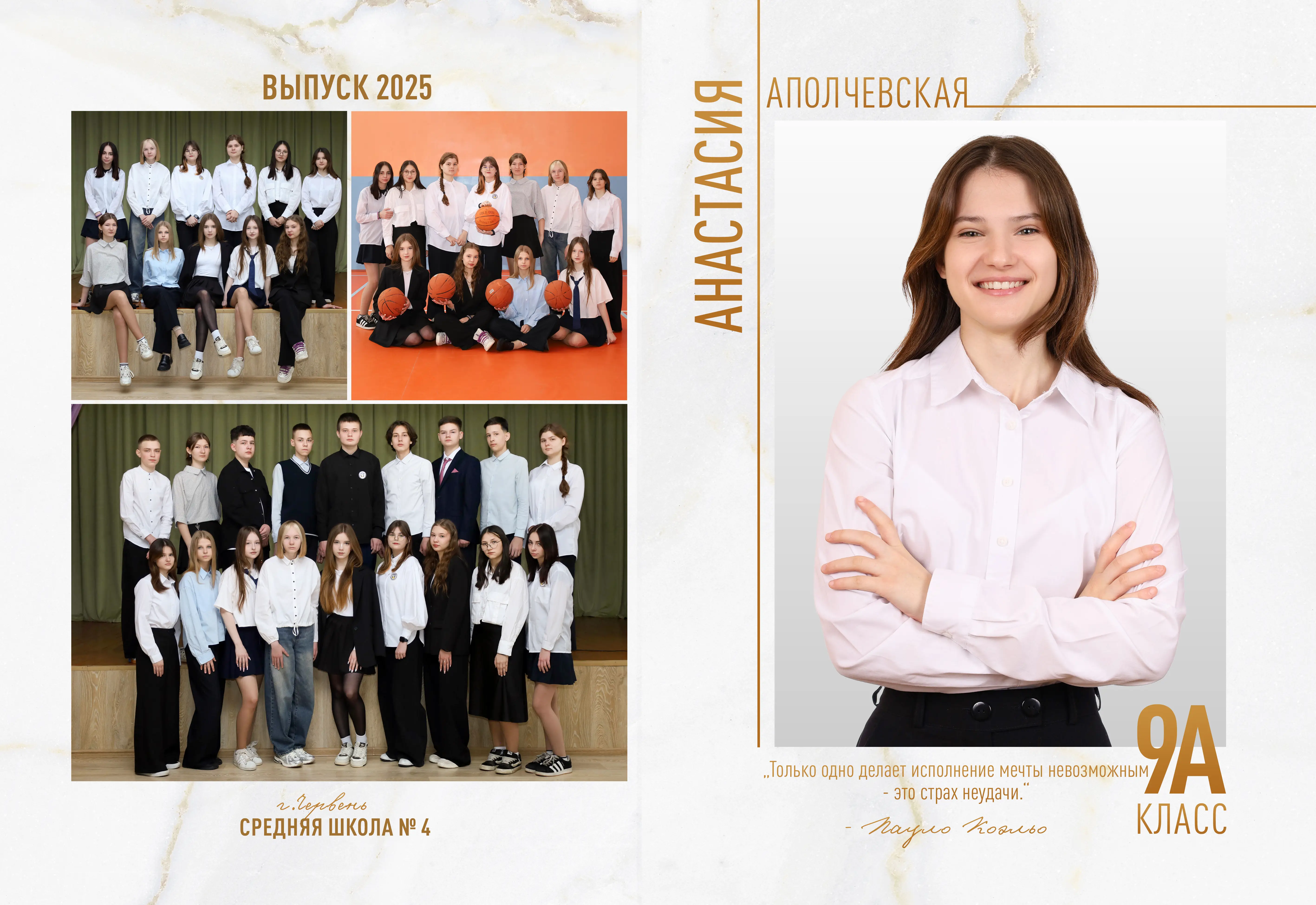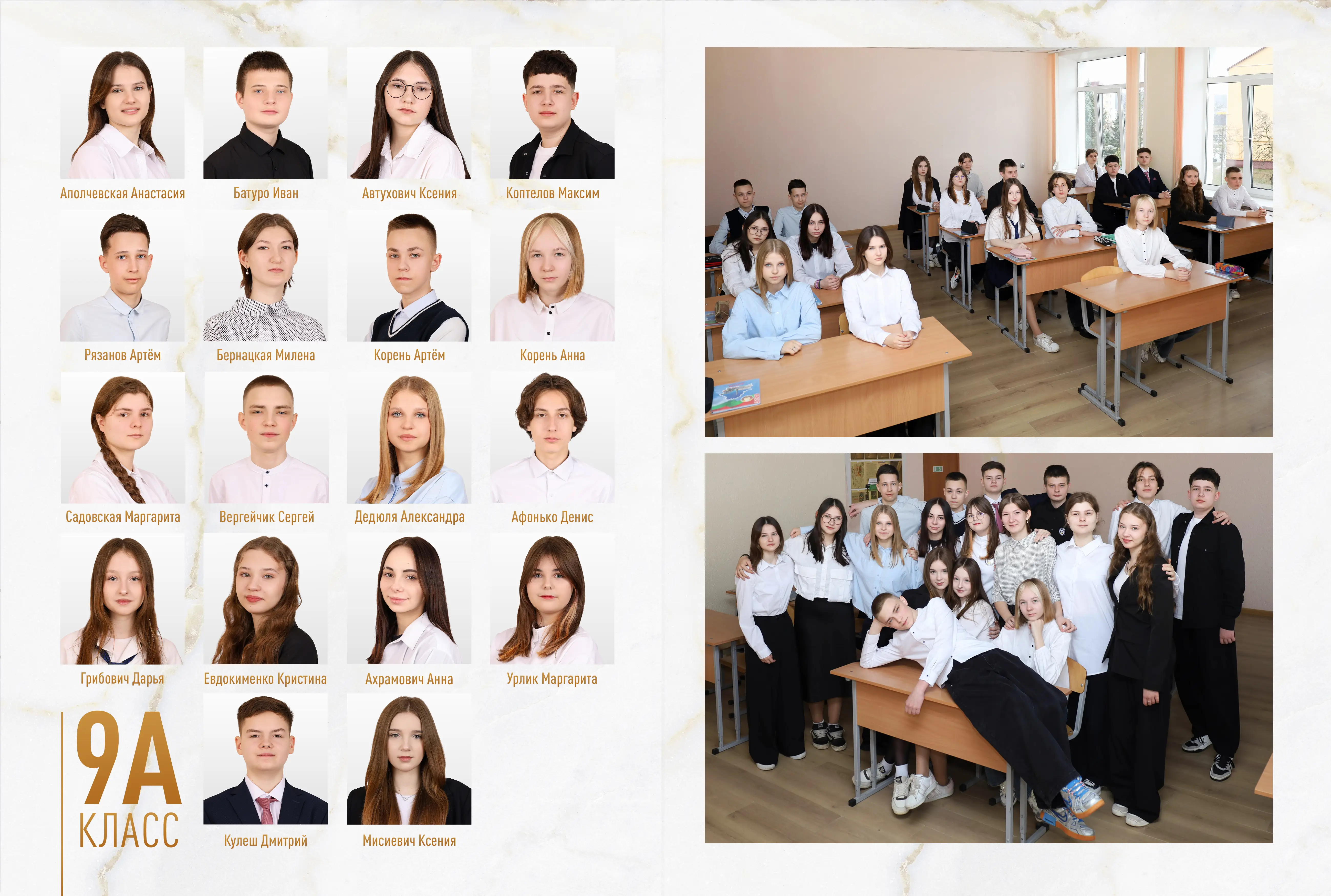 В разворот входит: 2 портрета (1 на обложке и 1 в виньетке), 1 общее фото всего класса, 1 общее фото девочек и 1 общее фото мальчиков.