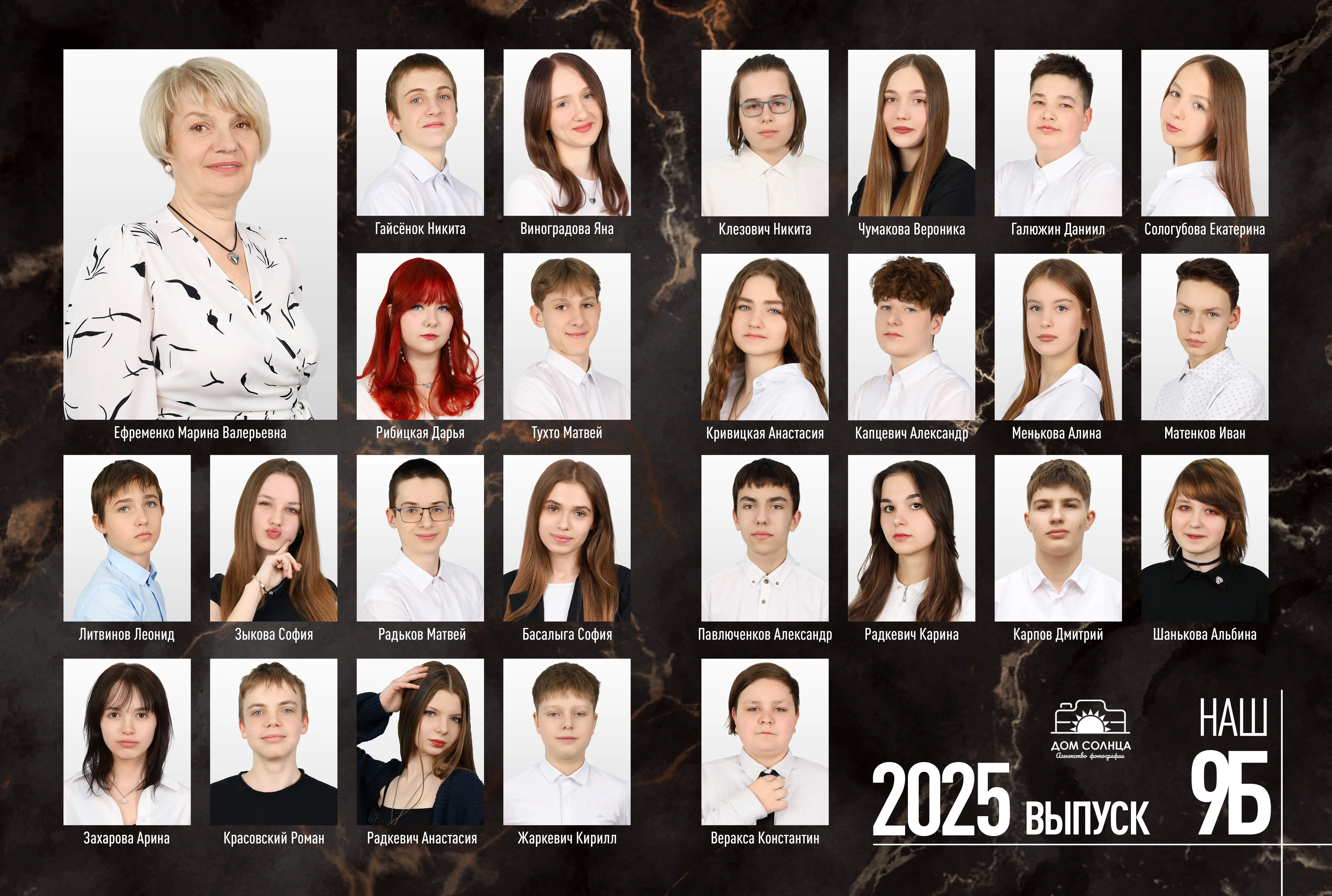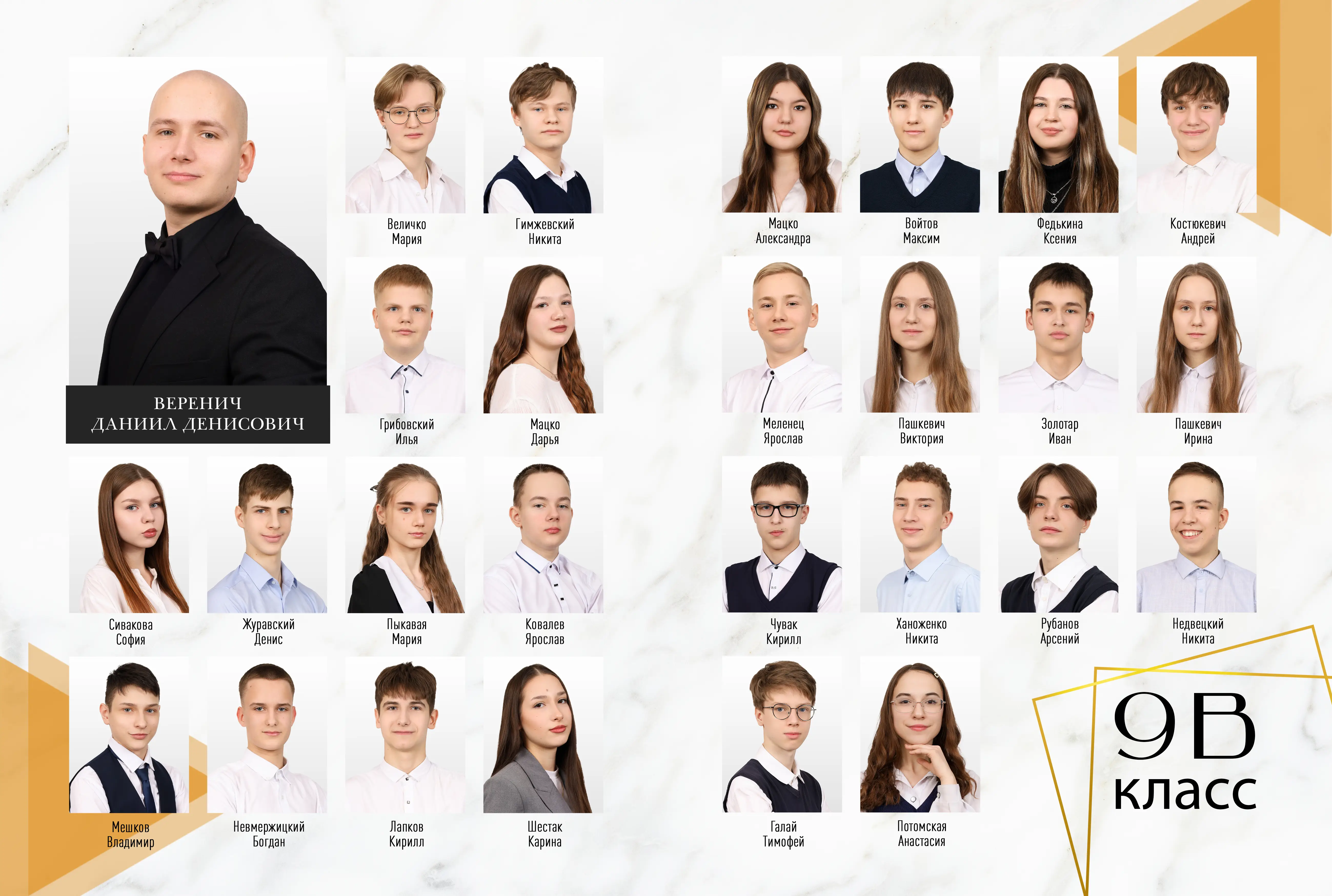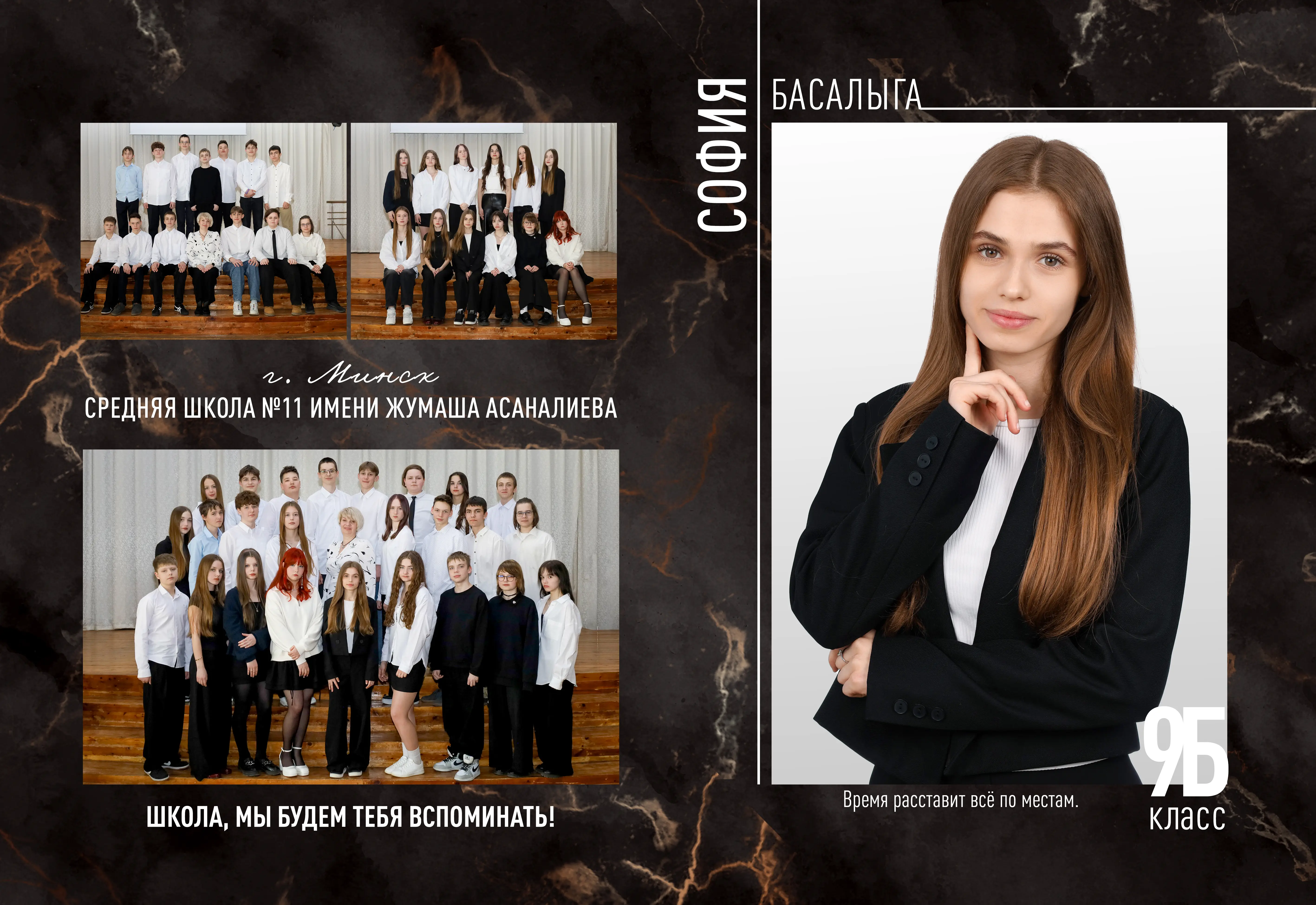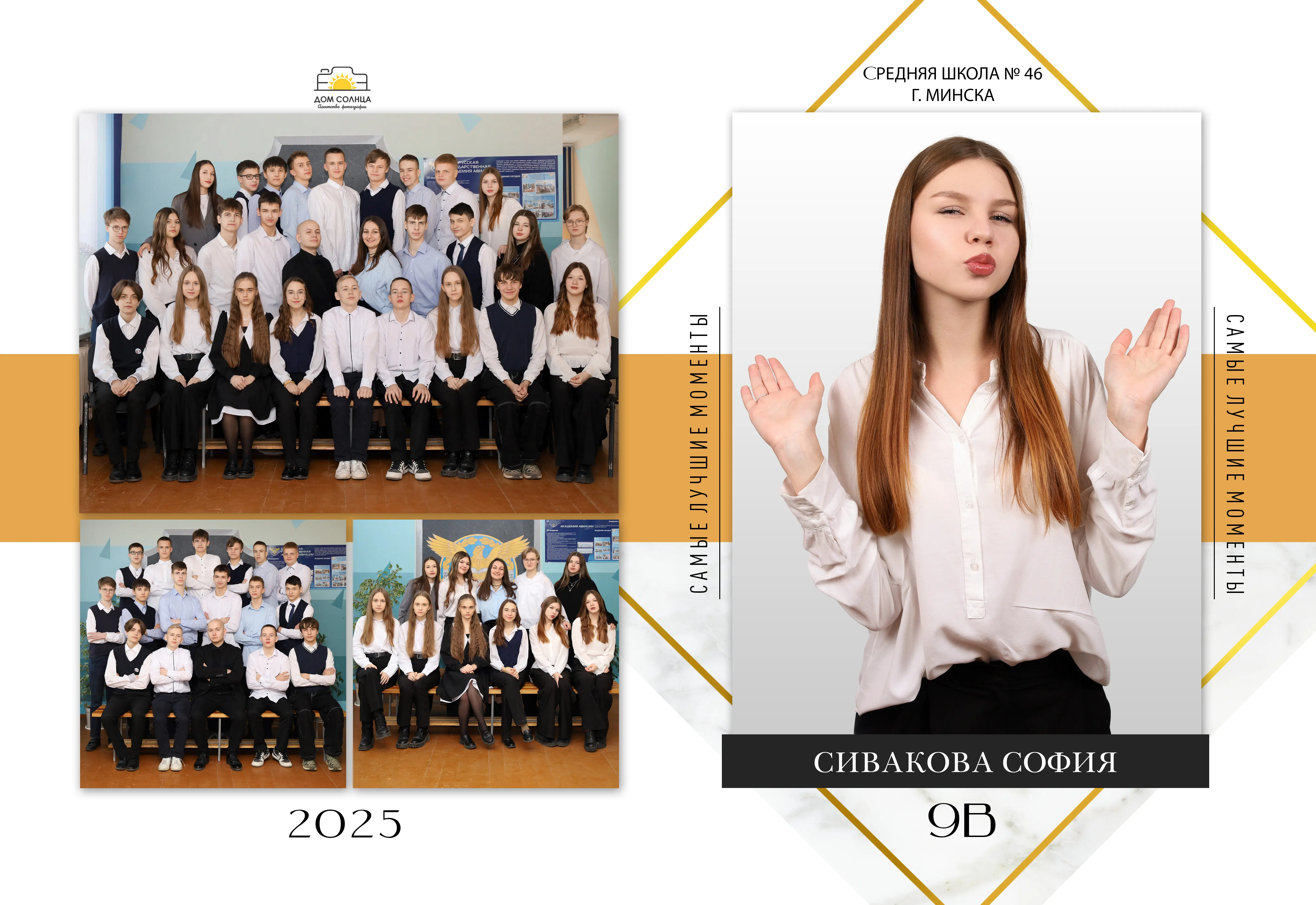 В разворот входит: 2 портрета (1 на обложке и 1 в виньетке), 1 общее фото всего класса, 1 общее фото девочек и 1 общее фото мальчиков.