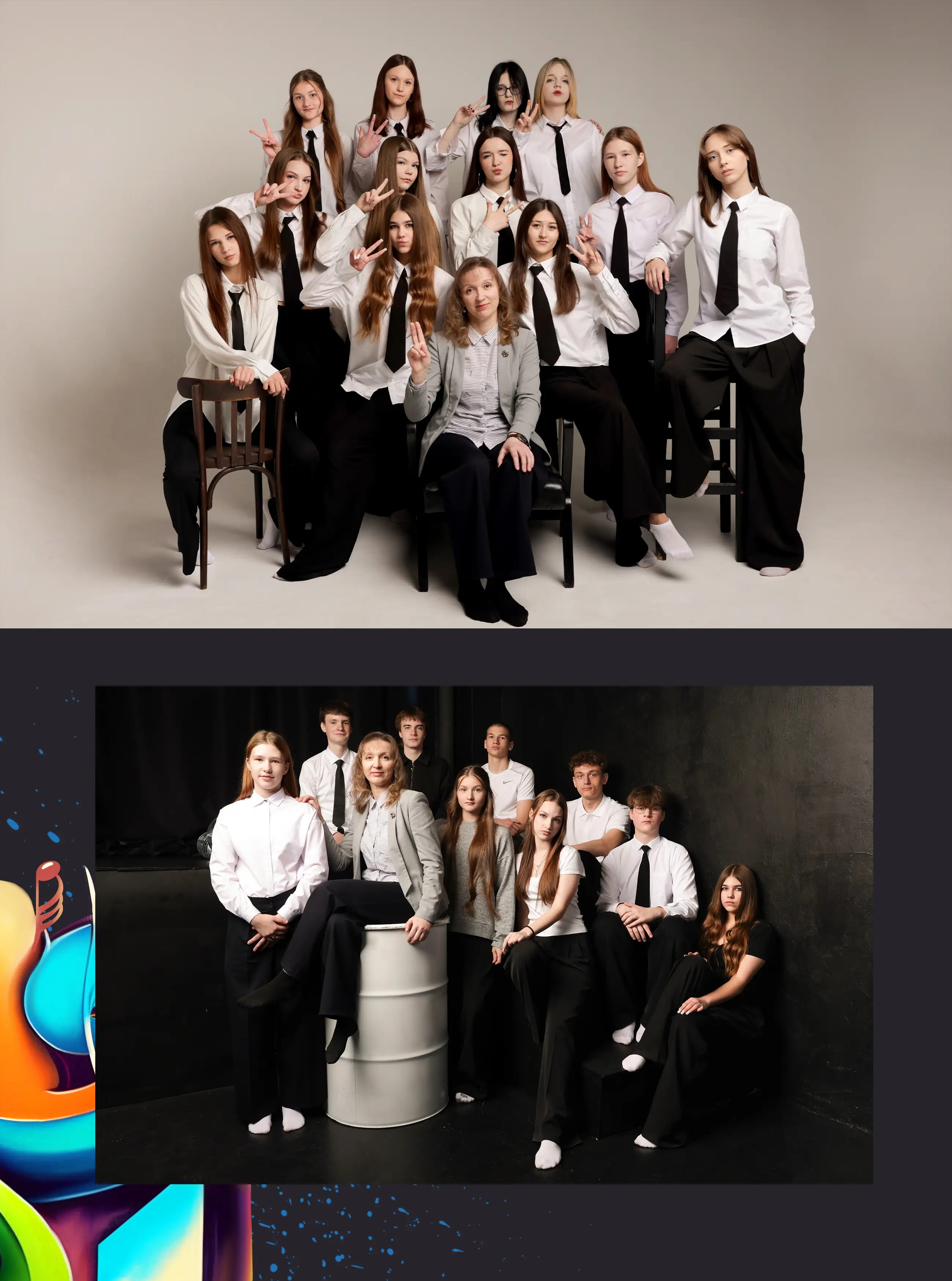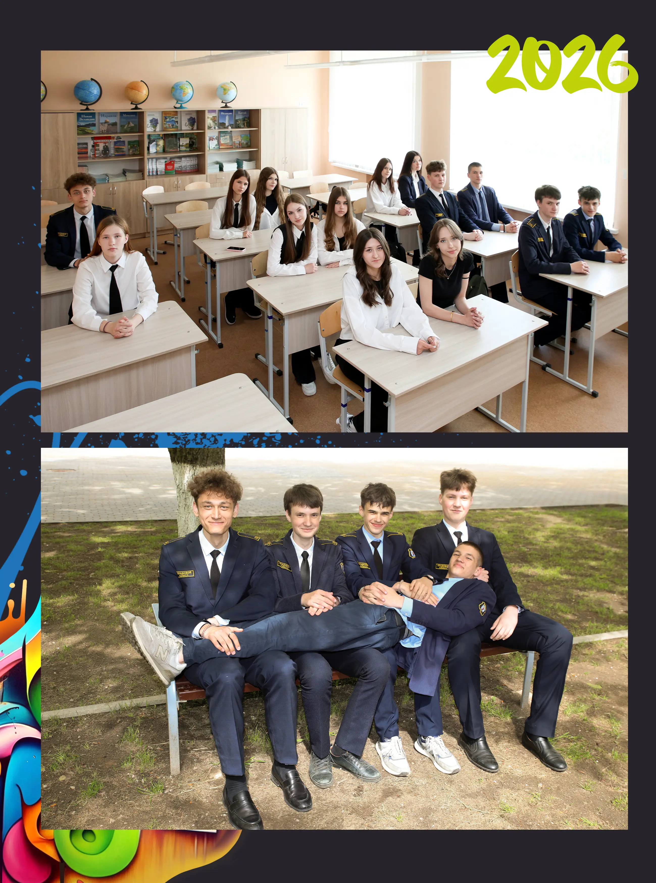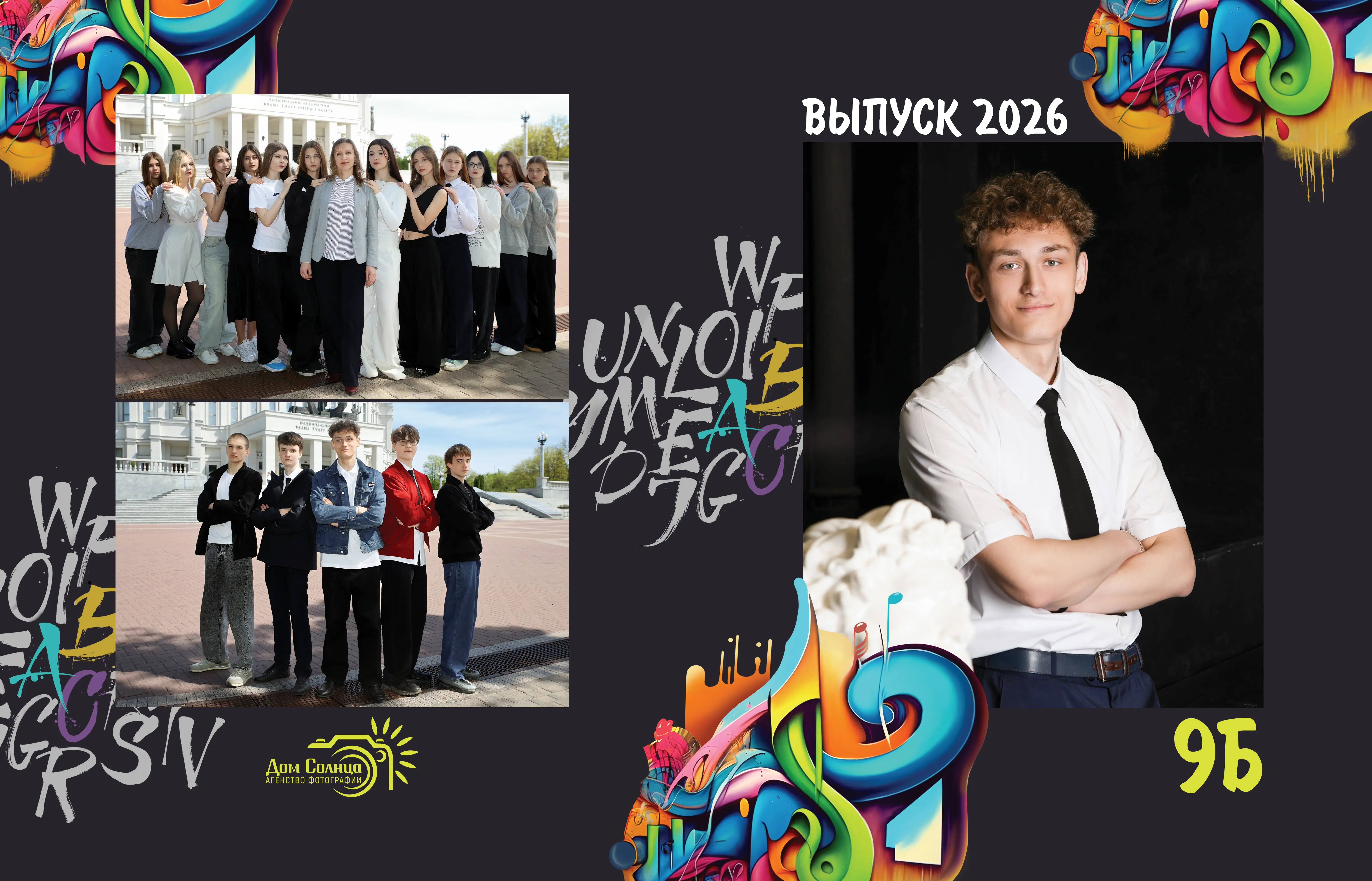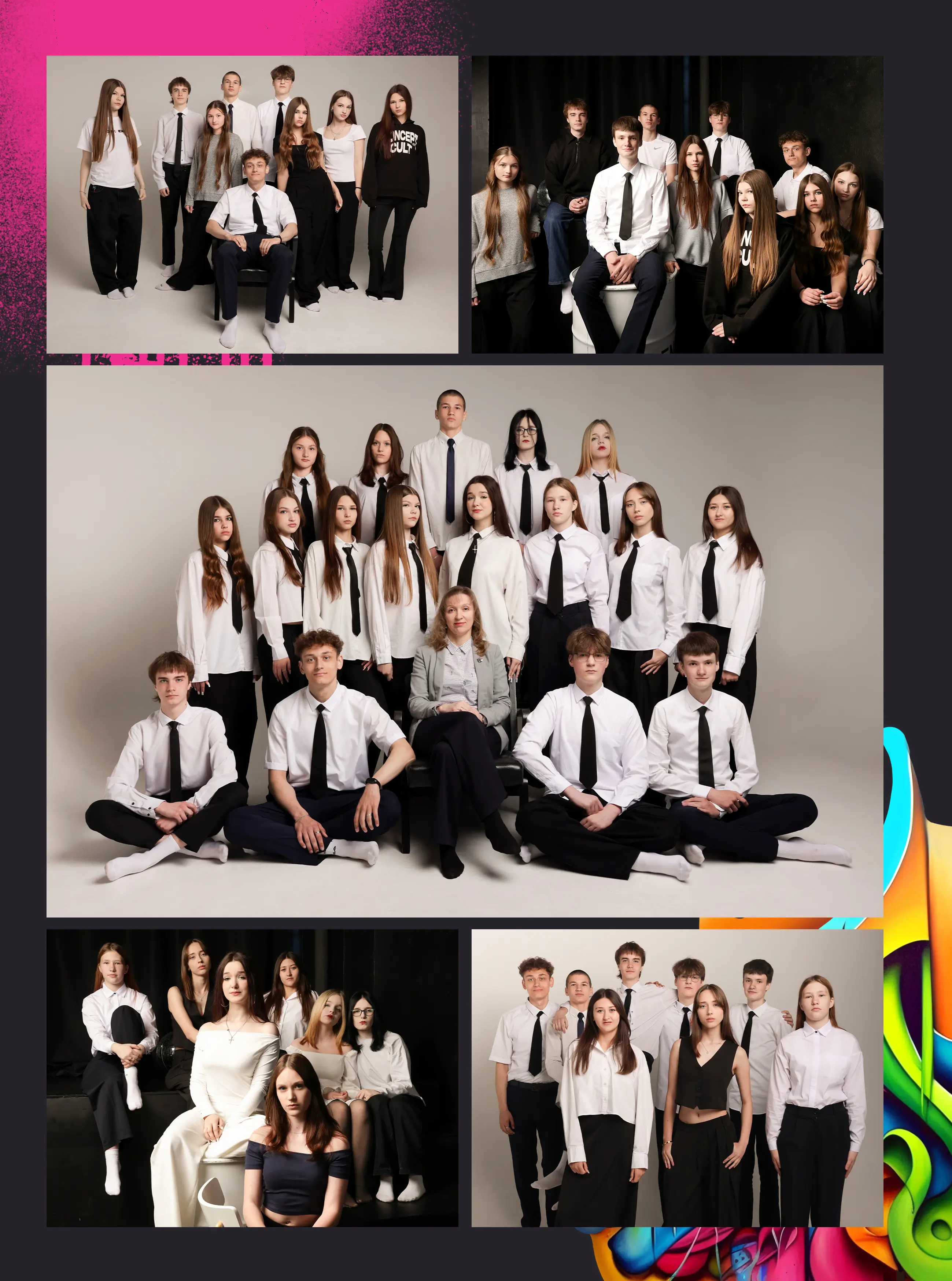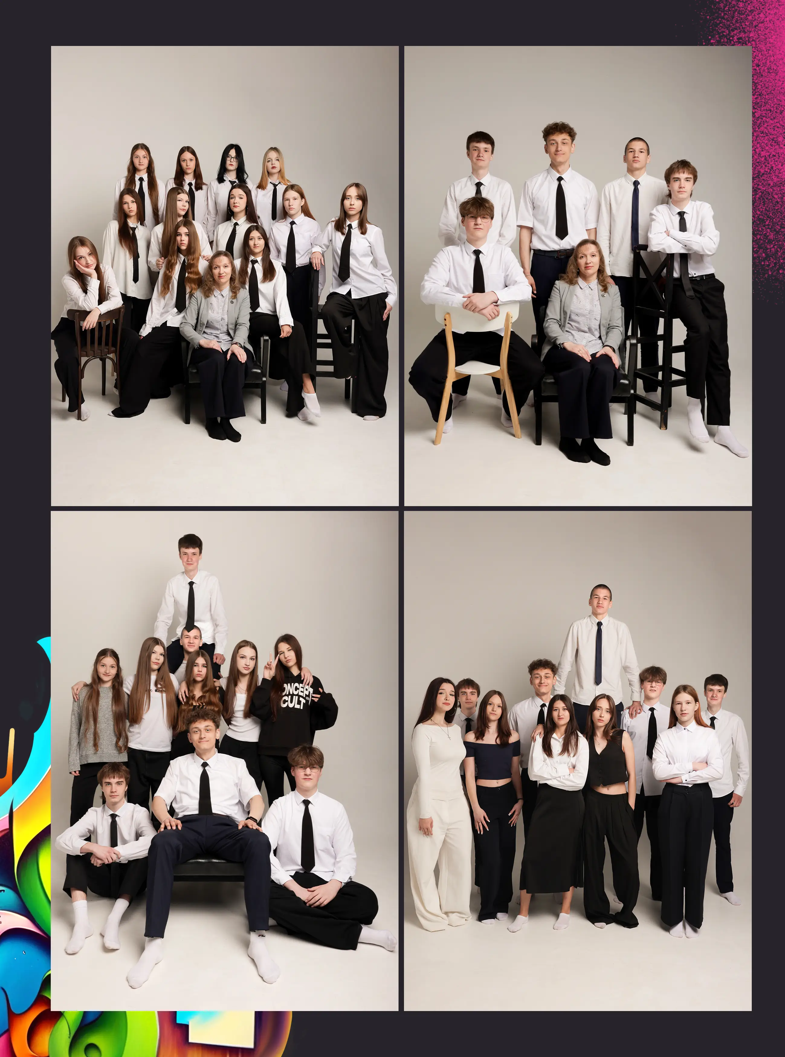 В альбом входит: 2-3 портрета (на обложке, внутри альбома, в виньетке), 1 общее фото всего класса, 1 общее фото девочек, 1 общее фото мальчиков, 45-55 сюжетных кадров (в зависимости от численности класса).