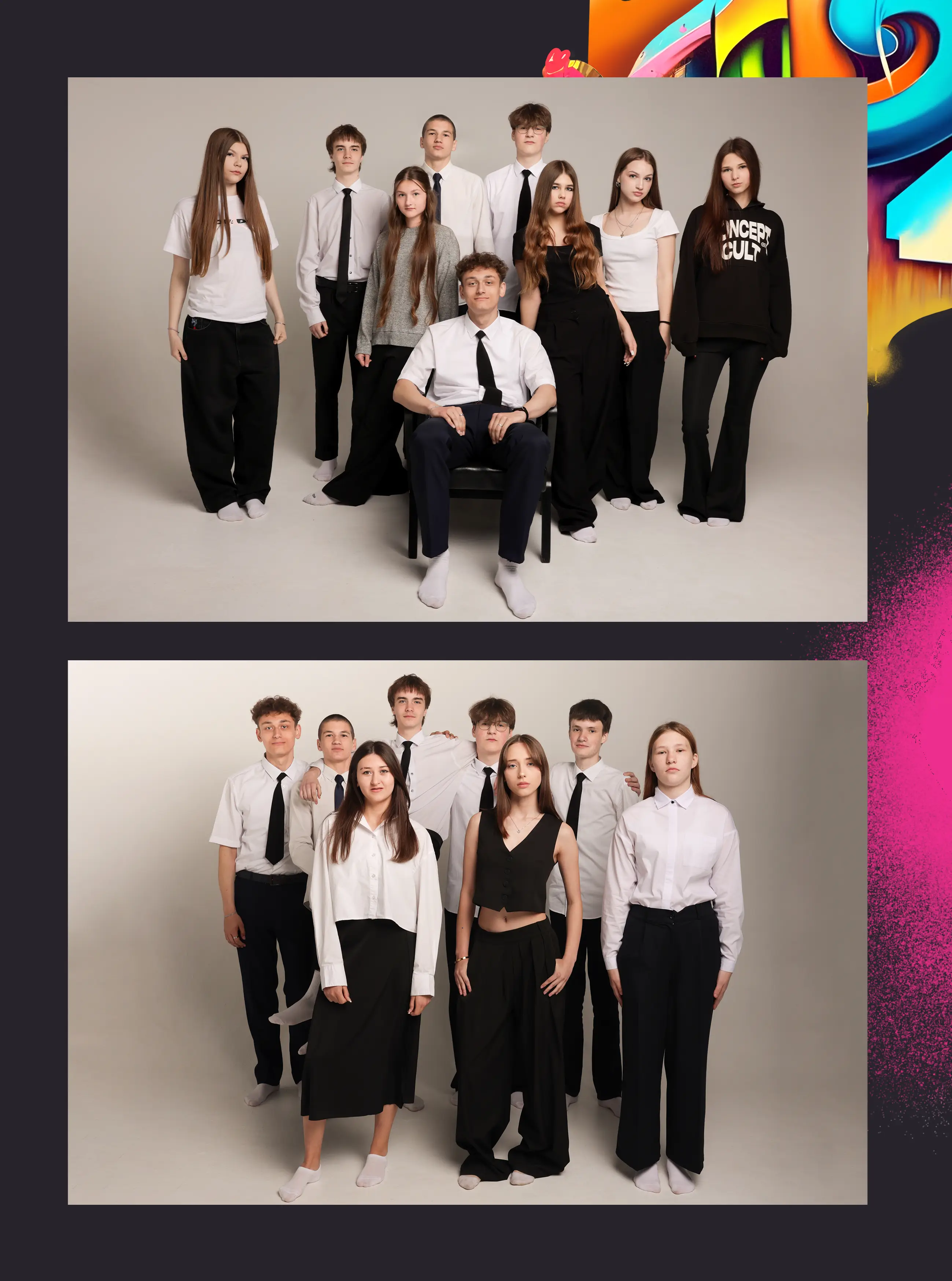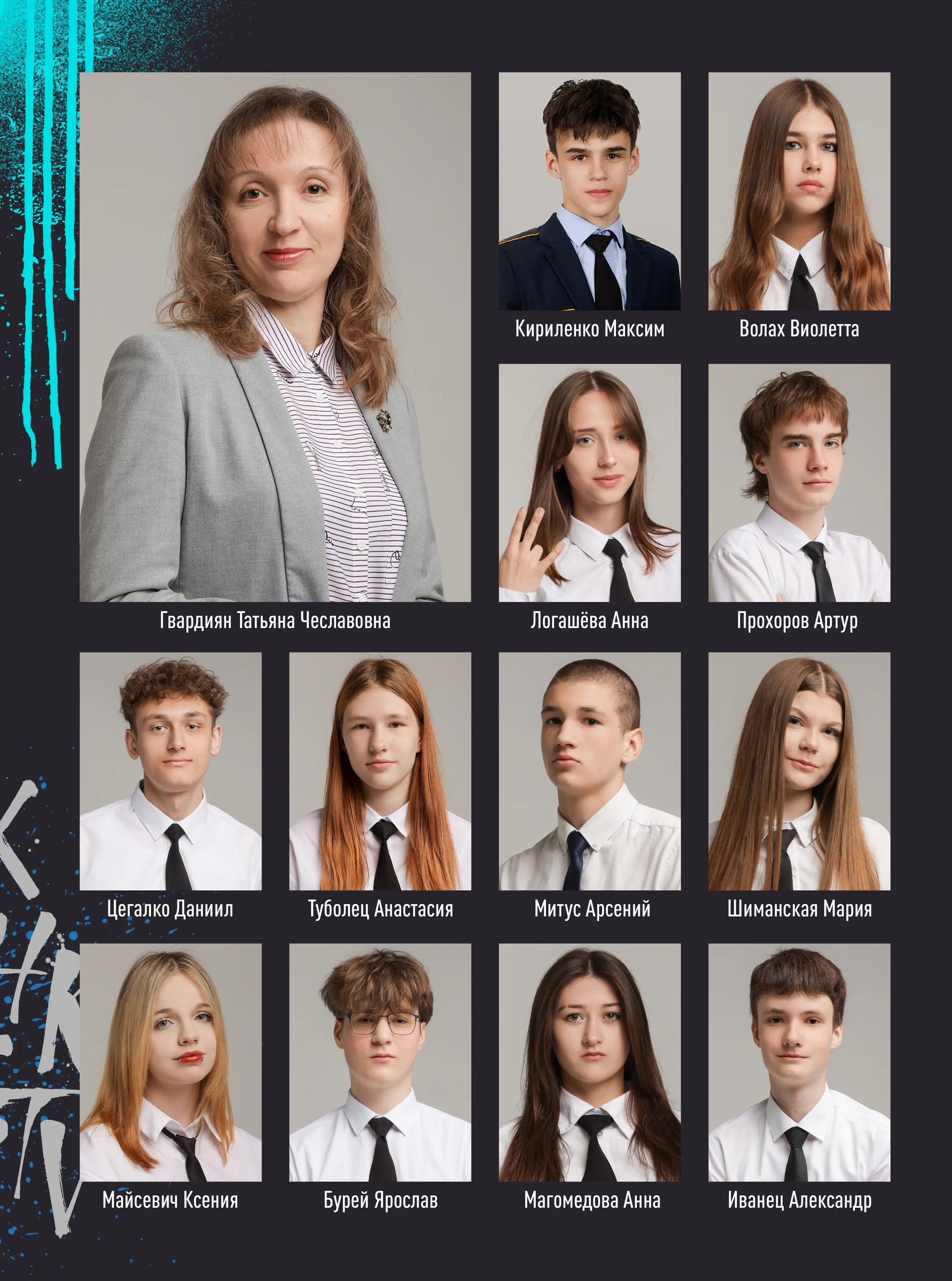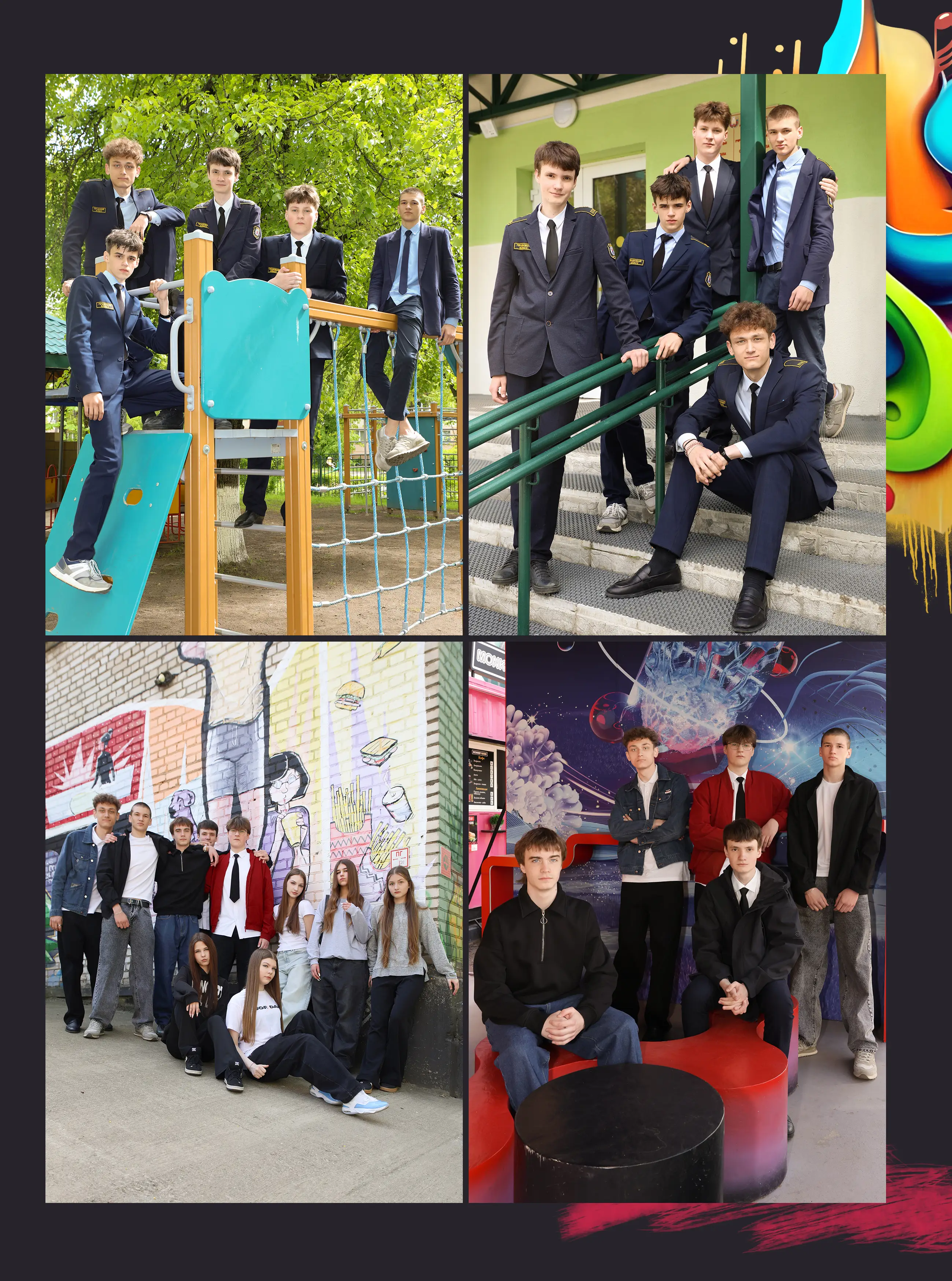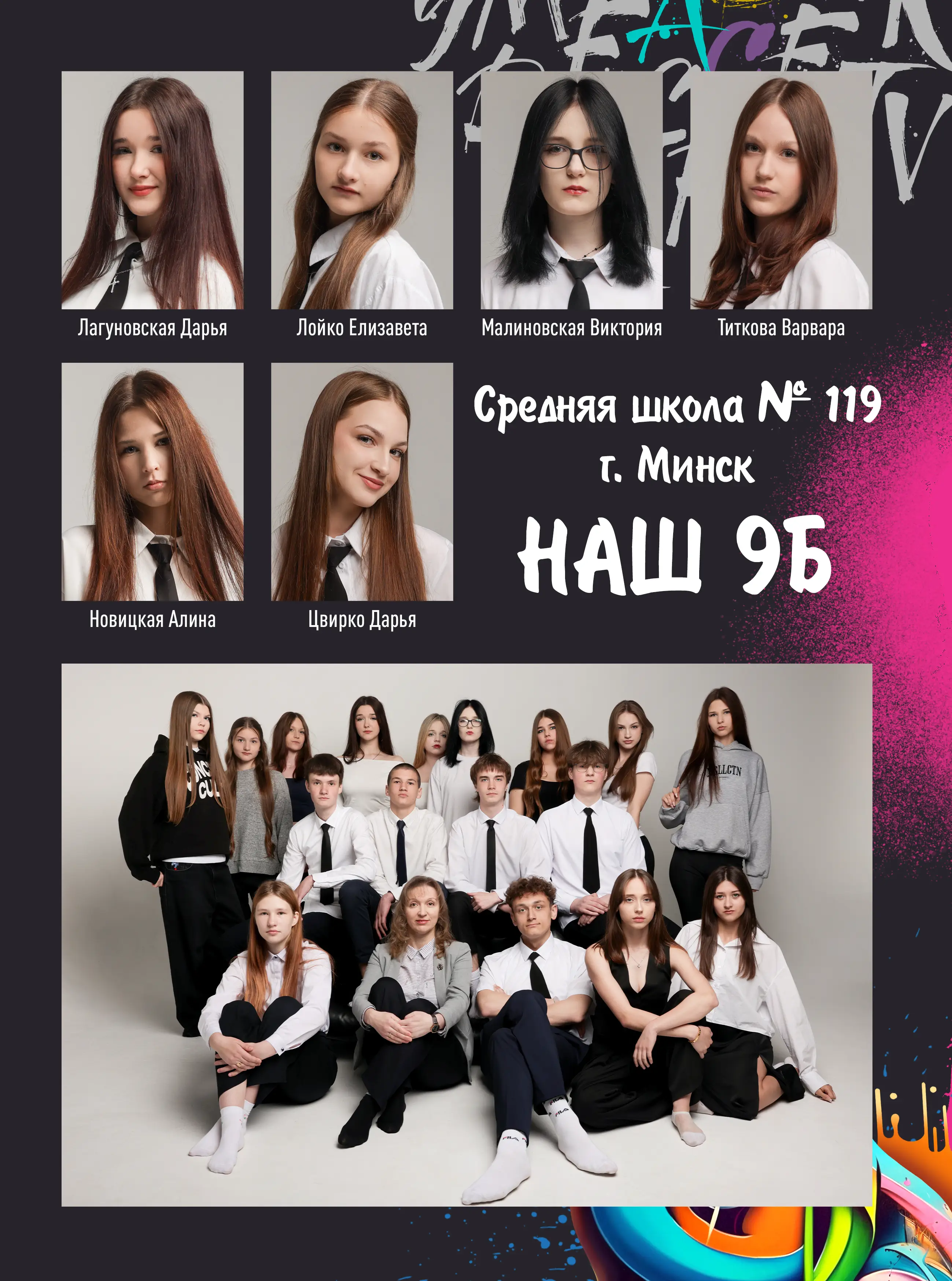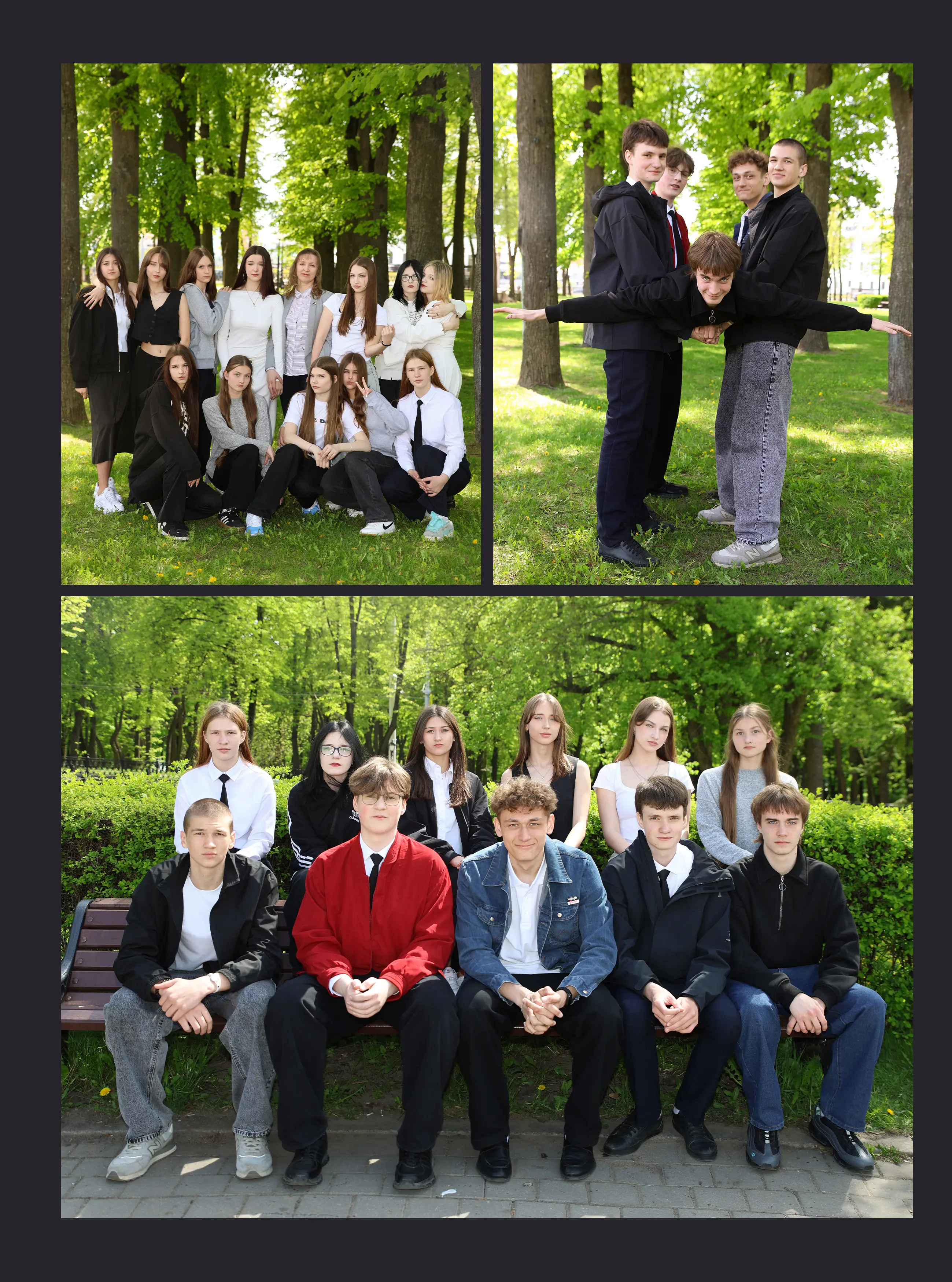 В альбом входит: 2-3 портрета (на обложке, внутри альбома, в виньетке), 1 общее фото всего класса, 1 общее фото девочек, 1 общее фото мальчиков, 45-55 сюжетных кадров (в зависимости от численности класса).