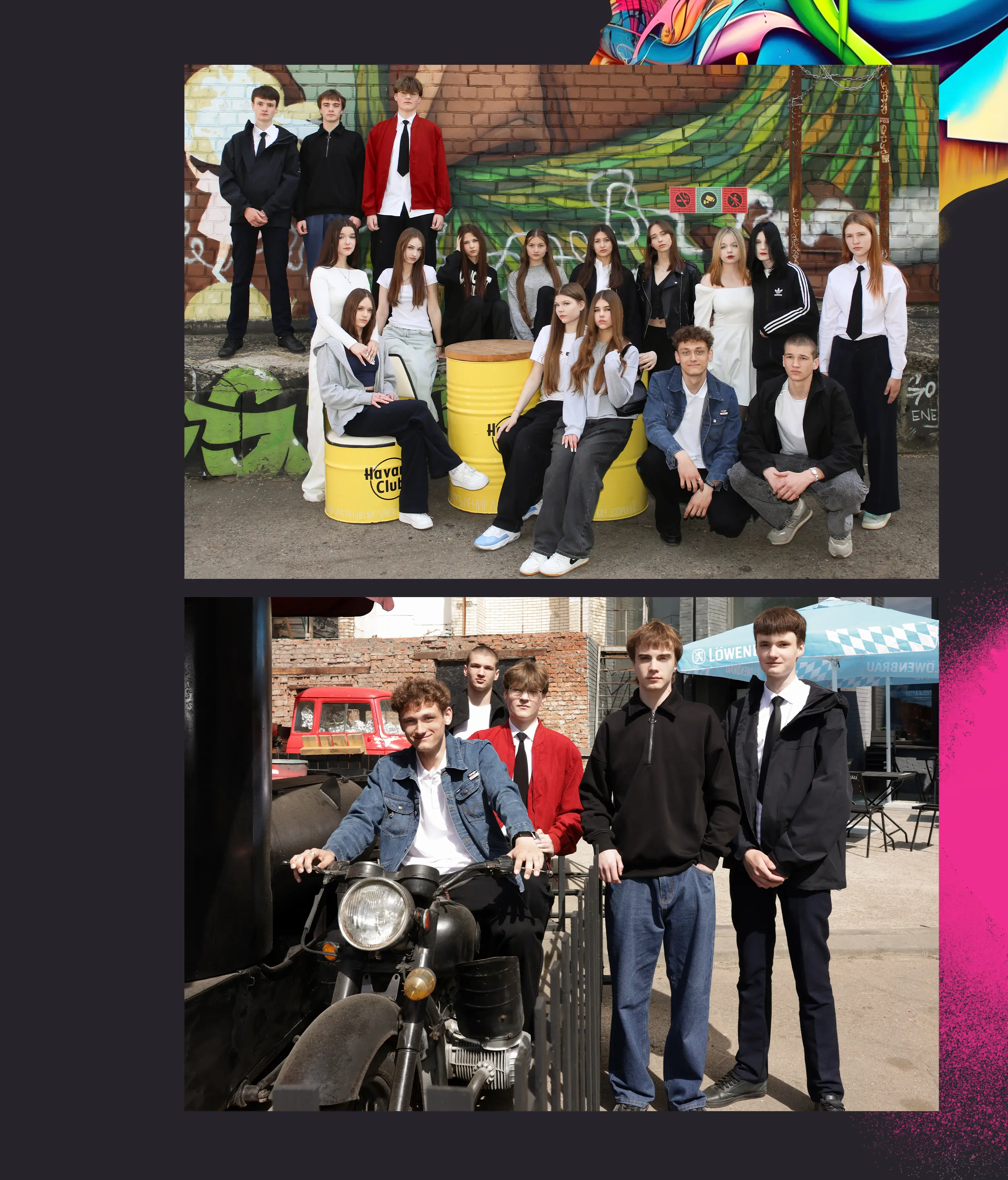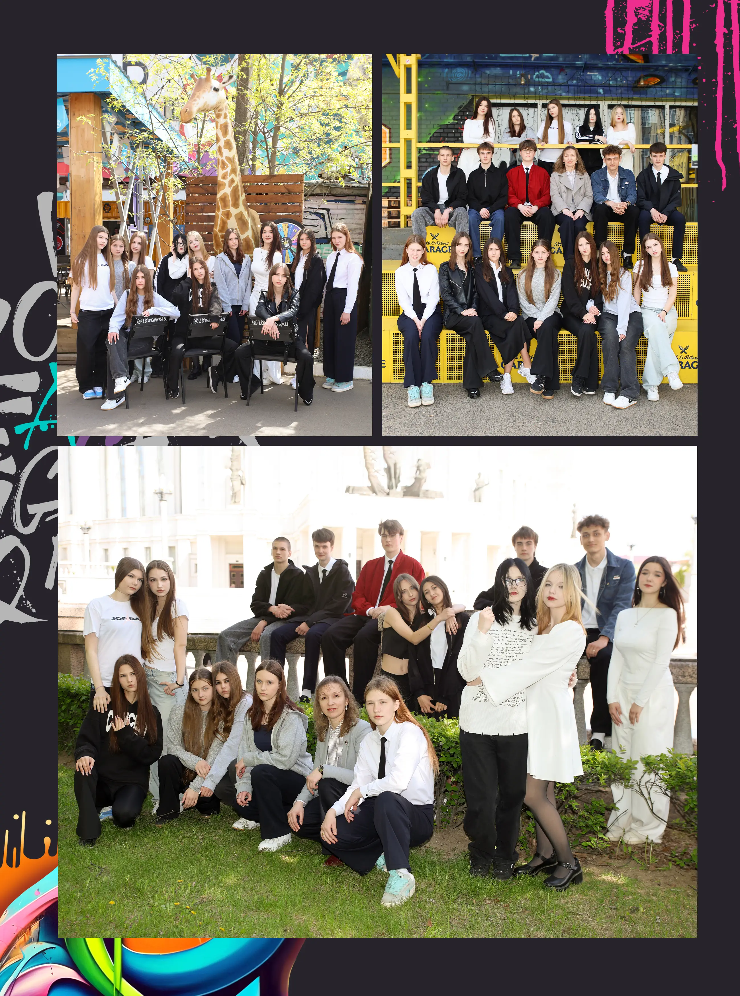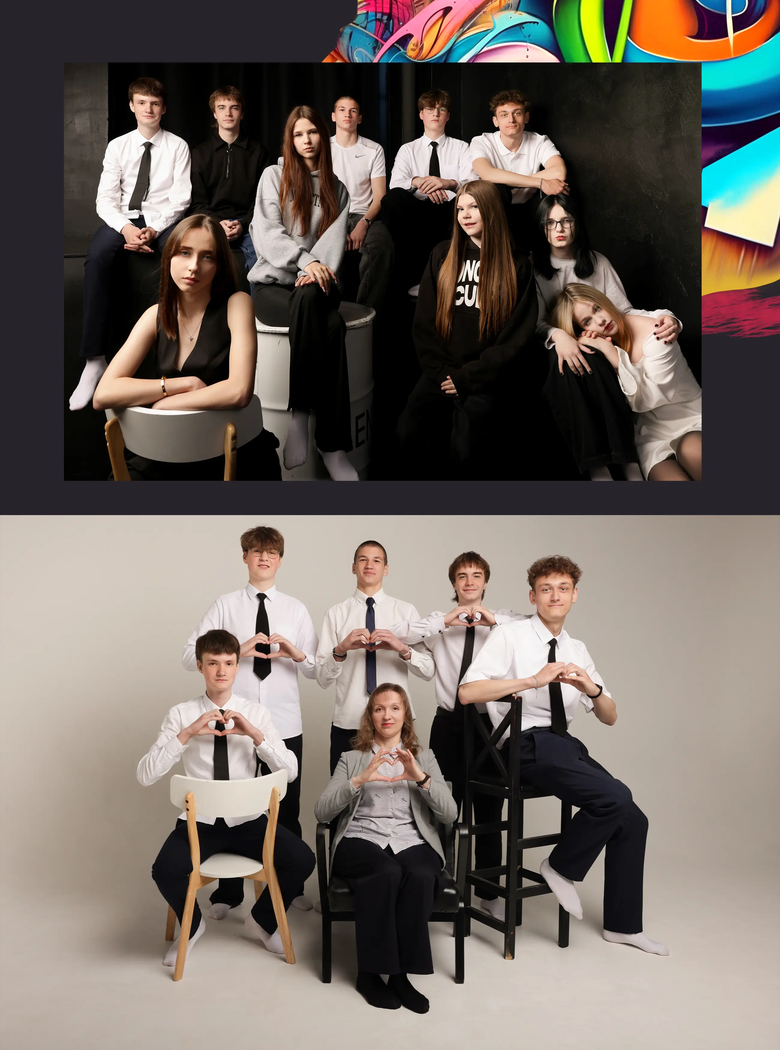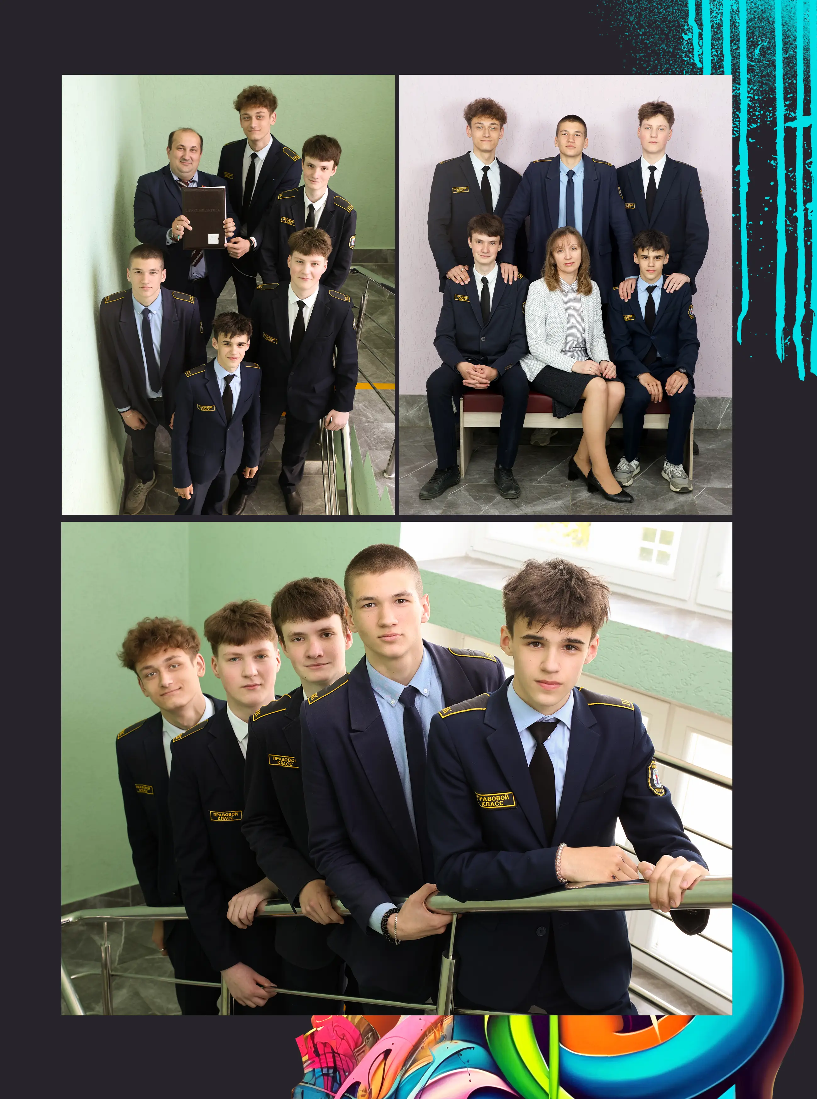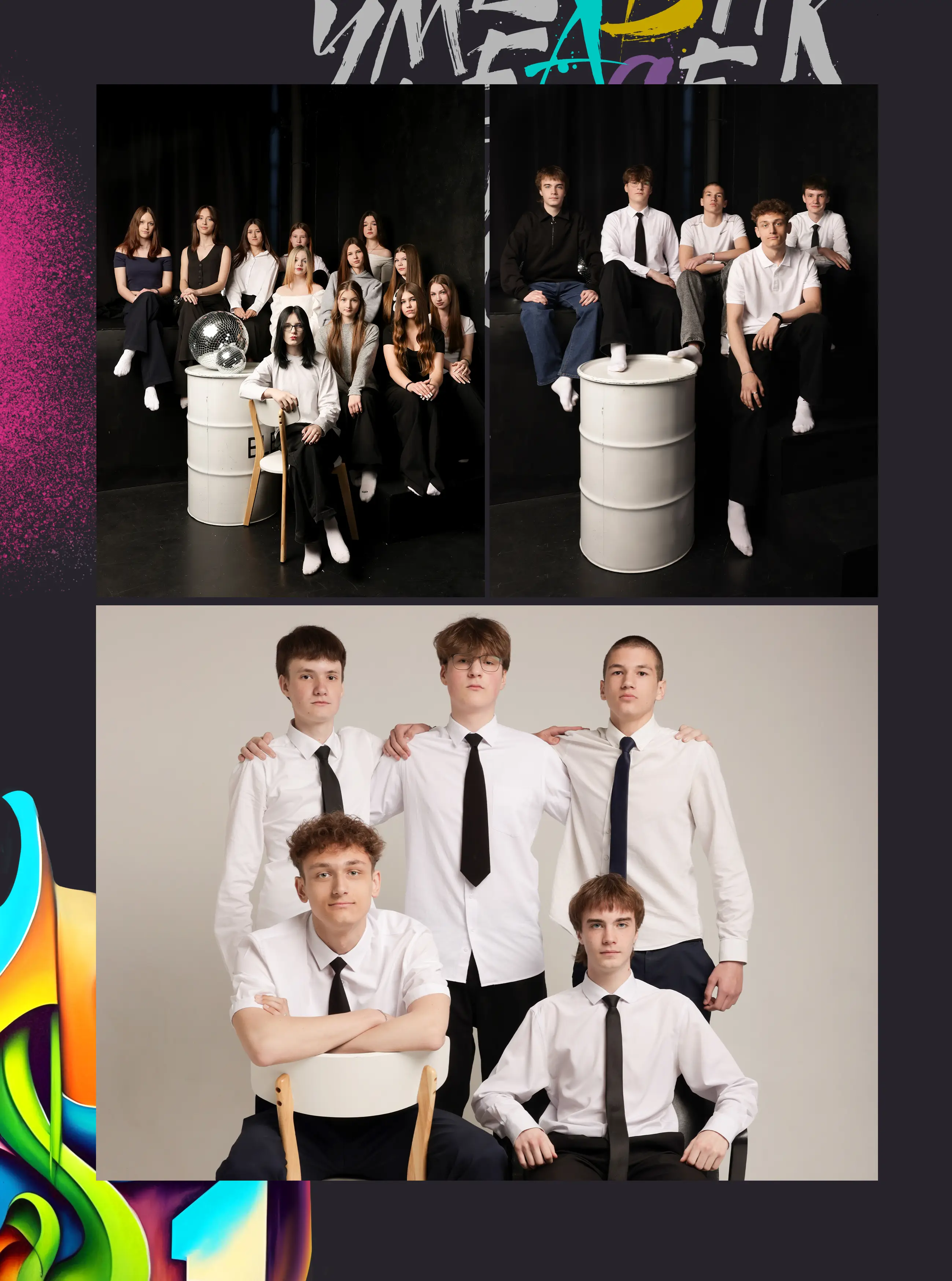 В альбом входит: 2-3 портрета (на обложке, внутри альбома, в виньетке), 1 общее фото всего класса, 1 общее фото девочек, 1 общее фото мальчиков, 45-55 сюжетных кадров (в зависимости от численности класса).